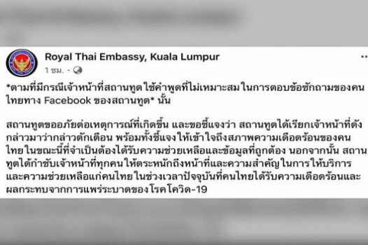 สถานเอกอัครราชทูตไทย ณ กรุงกัวลาลัมเปอร์ ขอโทษที่ใช้คำพูดไม่เหมาะสมตอบข้อซักถาม