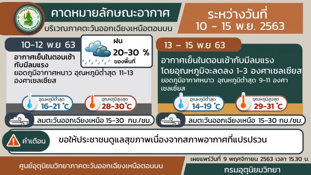 วันที่ 10 – 15 พ.ย. บริเวณความกดอากาศสูง หรือมวลอากาศเย็นกำลังค่อนข้างแรงอีกระลอกจากจีน จะแผ่ลงมาปกคลุมประเทศไทยตอนบน ทำให้ประเทศไทยตอนบน มีอุณหภูมิลดลง 2-4 องศาเซลเซียส กับมีอากาศเย็นและมีลมแรง