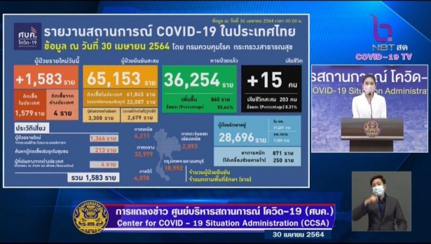 ศบค.แถลงยอดผู้ป่วย Covid-19 รายใหม่ วันที่ 30 เม.ย.64 ผู้ป่วยใหม่ 1,583 ราย ป่วยสะสม 65,153 ราย เสียชีวิตเพิ่ม 15 ราย สะสม 203 ราย .