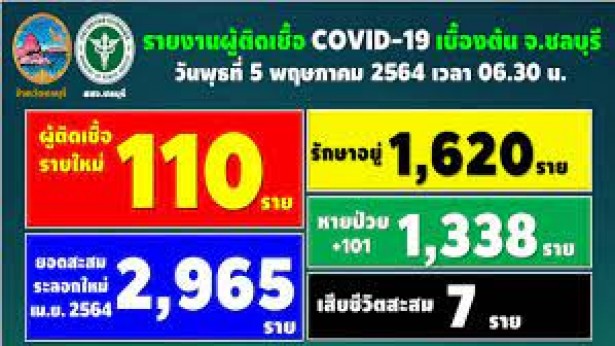 สำนักงานสาธารณสุขจังหวัด(สสจ.)ชลบุรี รายงานสถานการณ์โควิดจังหวัดชลบุรี วันนี้(5 พ.ค.) มีรายงานผู้ติดเชื้อรายใหม่ จำนวน 110 ราย พบมากที่สุดใน อ.บางละมุง 59 ราย รองลงมา อ.เมืองชลบุรี 21 ราย อ.ศรีราชา 9 ราย อ.พานทอง 6 ราย อ.บ้านบึง และ อ.เกาะจันทร์ อำเภอละ 4 ราย อ.สัตหีบ และ อ.พนัสนิคม อำเภอละ 2 ราย รวมยอดสะสมผู้ติดเชื้อระลอกใหม่เดือนเมษายน 2,965 ราย พบมากที่สุดใน อ.บางละมุง จำนวน 1,299 ราย รองลงมา อ.เมืองชลบุรี 796 ราย อ.ศรีราชา 346 ราย