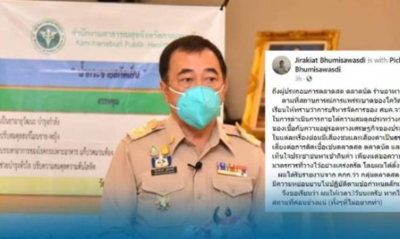 พ่อเมืองกาญจนบุรีงัดไม้แข็ง เตือนผู้ประกอบการตลาดสด ตลาดนัด ร้านอาหาร ให้ปฏิบัติตามมาตรการสาธารณสุขอย่างเคร่งครัด เพื่อสกัดเชื้อโควิดลุกลาม ขีดเส้นตายให้เวลา 3 วัน ถ้ายังหย่อนยาน จะออกคำสั่งปิดสถานที่ชั่วคราว