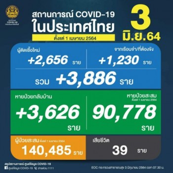 ศบค.รายงานพบผู้ติดเชื้อ 3,886 ราย เสียชีวิต 39 ราย หายกลับบ้านแล้ว 3,626 คน
