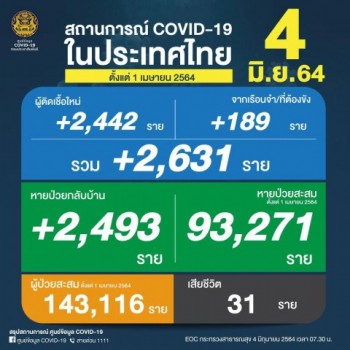ศบค.เผยตัวเลขผู้ติดเชื้อรายใหม่ 2,631 ราย หา่ยป่วยกลับบ้าน 2,493 ราย