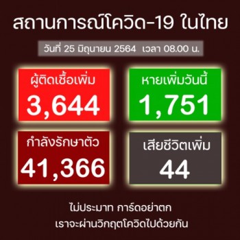 ประเทศไทยพบผู้ติดเชื้อเพิ่มขึ้นอีก 3,644 ราย