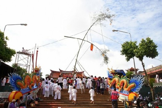 ศาลเจ้ากิวอ๋องเอี่ย ใน จ.ตรัง ทำพิธียกเสาเต็งโก ประกาศเป็นการเริ่มกินเจ