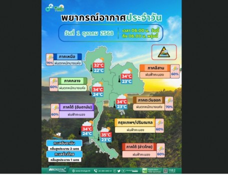 พยากรณ์อากาศ 24 ชั่วโมงข้างหน้า ประเทศไทยยังคงมีฝนตกหนักบางแห่ง โดยเฉพาะบริเวณจังหวัดแม่ฮ่องสอน เชียงใหม่ เชียงราย ลำพูน ลำปาง พะเยา น่าน อุตรดิตถ์ สุโขทัย และตาก ขอให้ประชาชนในบริเวณดังกล่าวระวังอันตรายจากฝนตกหนักและฝนที่ตกสะสม ซึ่งอาจทำให้เกิดน้ำท่วมฉับพลัน น้ำป่าไหลหลาก และน้ำล้นตลิ่ง โดยเฉพาะพื้นที่ลาดเชิงเขาใกล้ทางน้ำไหลผ่าน พื้นที่ลุ่ม และพื้นที่น้ำท่วมขัง เนื่องจากมีลมตะวันออกและลมตะวันออกเฉียงใต้พัดปกคลุมภาคตะวันออกเฉียงเหนือ ในขณะที่มรสุมตะวันตกเฉียงใต้ที่พัดปกคลุมทะเลอันดามัน ประเทศไทย และอ่าวไทยมีกำลังอ่อนลง
