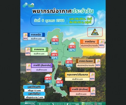 อนึ่ง เมื่อเวลา 01.00 น. ของวันนี้ (6 ต.ค. 68) พายุไต้ฝุ่น“แมตโม” (MATMO) ได้อ่อนกำลังลงเป็นพายุโซนร้อนกำลังแรง และเคลื่อนขึ้นฝั่งบริเวณมณฑลกว่างซี ทางตอนใต้ประเทศจีนแล้ว กำลังเคลื่อนตัวทางทิศตะวันตกเฉียงเหนือ หลังจากนั้นจะอ่อนกำลังลงอย่างรวดเร็วตามลำดับ โดยพายุนี้ไม่เคลื่อนเข้าสู่ประเทศไทย