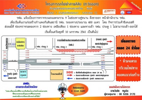 การรถไฟฟ้าขนส่งมวลชนแห่งประเทศไทย หรือ รฟม.แจ้งว่า กิจการร่วมค้า ซีเคเอสที ผู้รับจ้างงานโยธาอุโมงค์ทางวิ่งและสถานีใต้ดิน สัญญาที่ 1 ช่วงศูนย์วัฒนธรรมแห่ง ประเทศไทย - รามคำแหง 12 โครงการรถไฟฟ้าสายสีส้ม (ตะวันออก) ช่วงศูนย์วัฒนธรรม แห่งประเทศไทย – มีนบุรี มีความจำเป็นต้องเบี่ยงการจราจรบนถนนพระราม 9 ฝั่งขาออก ในช่องทางคู่ขนานจากบริเวณ รฟม. ประตู 2 ไปทางคลองชวดใหญ่ เป็นระยะทาง ประมาณ 400 เมตร เพื่อเริ่มต้นงานก่อสร้างกำแพงกันดิน ตั้งแต่วันพุธที่ 10 มกราคม 2561 เป็นต้นไป ตลอด 24 ชั่วโมง โดยจะส่งผลให้ช่องจราจรลดลงจาก 2 ช่องทาง เหลือ 1 ช่องทาง ทางเข้า รฟม. ประตู 1 ไม่สามารถเข้าออกได้