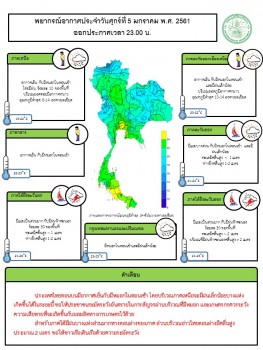 กรมอุตุนิยมวิทยา พยากรณ์อากาศ 24 ชั่วโมงข้างหน้า ประเทศไทยตอนบน มีอากาศเย็น กับมีหมอกในตอนเช้า โดยภาคเหนือจะมีฝนเล็กน้อยบางแห่งในระยะนี้ ขอให้ประชาชน ระมัดระวังอันตรายในการสัญจรผ่านบริเวณที่มีหมอก และเกษตรกรควรระวังความเสียหาย ที่จะเกิดขึ้นกับผลผลิตทางการเกษตรไว้ด้วย สำหรับภาคใต้มีฝนบางแห่ง ส่วนมากทางตอนล่างของภาค ส่วนอ่าวไทยตอนล่างมีคลื่นสูง ประมาณ 2 เมตร ขอให้ชาวเรือเดินเรือด้วยความระมัดระวัง ลักษณะสำคัญทางอุตุนิยมวิทยา บริเวณความกดอากาศสูงที่ปกคลุมประเทศไทยตอนบน มีกำลังปานกลาง ทำให้บริเวณดังกล่าวมีหมอกในตอนเช้า แต่ยังคงมีอากาศเย็นโดยทั่วไป ในขณะที่กระแสลมฝ่ายตะวันตกจากประเทศเมียนมา เคลื่อนเข้าปกคลุมภาคเหนือตอนบน ทำให้ภาคเหนือตอนบนมีฝนเกิดขึ้น สำหรับมรสุมตะวันออกเฉียงเหนือที่พัดปกคลุมอ่าวไทย และภาคใต้มีกำลังอ่อนลง ทำให้คลื่นลมบริเวณอ่าวไทยตอนล่างมีกำลังปานกลาง กรุงเทพมหานครและปริมณฑล มีหมอกในตอนเช้า และมีฝนเล็กน้อย อุณหภูมิต่ำสุด 23-25 องศาเซลเซียส อุณหภูมิสูงสุด 32-34 องศาเซลเซียส