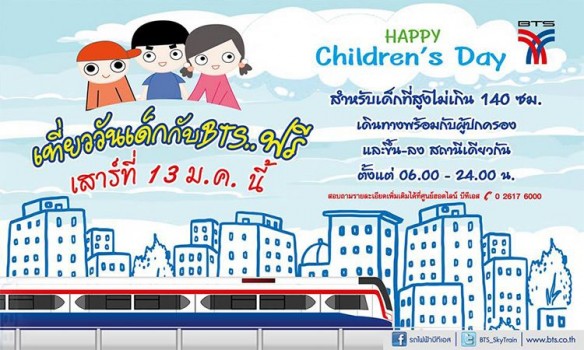 นายสุรพงษ์ เลาหะอัญญา กรรมการผู้อำนวยการใหญ่ บริษัท ระบบขนส่งมวลชน กรุงเทพ จำกัด (มหาชน) หรือรถไฟฟ้าบีทีเอส แจ้งว่า วันเด็กแห่งชาติ เสาร์ที่ 13 มกราคม ตั้งแต่เวลา 06.00 - 24.00 น. บริษัทเปิดโอกาสให้เด็กที่มีส่วนสูงไม่เกิน 140 เซนติเมตร นั่งรถไฟฟ้าบีทีเอสฟรีตลอดทุกเส้นทาง รวมทั้งสถานีในส่วนต่อขยายสายสุขุมวิท และสายสีลม ซึ่งปกติจะยกเว้นค่าโดยสารเฉพาะเด็กที่มีส่วนสูงไม่เกิน 90 เซนติเมตร เพื่อเป็นการร่วมฉลองวันเด็กแห่งชาติ และส่งเสริมให้เด็ก ๆ ได้เดินทางไปร่วมงาน และทำกิจกรรมร่วมกับครอบครัวได้อย่างสะดวกสบายตามสถานที่ต่างๆ โดยบริษัทฯ จะจัดเจ้าหน้าที่คอยดูแลอำนวยความสะดวกให้เด็กและผู้ปกครองเพื่อ เข้า - ออกในระบบอย่างปลอดภัยโดยผ่านประตูพิเศษ ซึ่งสามารถติดต่อขอรับคูปอง การเดินทางได้ทุกสถานี สำหรับสถานที่จัดกิจกรรมวันเด็กในเส้นทางรถไฟฟ้า อาทิ ไปท่องโลกวิทยาศาสตร์ ที่พิพิธภัณฑ์เด็กกรุงเทพมหานคร สถานีหมอชิต หรือเข้าชมท้องฟ้าจำลอง ที่ศูนย์ วิทยาศาสตร์เพื่อการศึกษา โดยลงสถานีเอกมัย หรือไปร่วมกิจกรรมวันเด็กศิลป์ ที่หอศิลปวัฒนธรรมแห่งกรุงเทพมหานคร ที่สถานีสนามกีฬาแห่งชาติ ต่อด้วยท่องไป ในดินแดนเวทมนตร์ กับงาน ‘Harry Potter: Christmas in The Wizarding World’ ณ ห้างสรรพสินค้า สยามพารากอน โดยลงรถไฟฟ้าที่สถานีสยาม จบวันด้วย ชมสัตว์โลกล้านปี ที่ Dinosaur Planet โดยลงที่สถานีพร้อมพงษ์ สามารถสอบถามรายละเอียดเพิ่มเติมได้ที่ศูนย์ฮอตไลน์บีทีเอส โทรศัพท์ 0 2617 6000