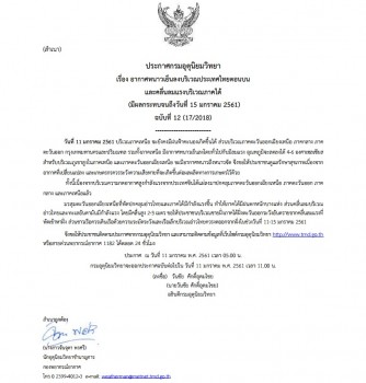 ประกาศกรมอุตุนิยมวิทยา "อากาศหนาวเย็นลงบริเวณประเทศไทยตอนบน และคลื่นลมแรงบริเวณภาคใต้ (มีผลกระทบจนถึงวันที่ 15 มกราคม 2561)" ฉบับที่ 12 วันนี้ บริเวณภาคเหนือ จะยังคงมีฝนฟ้าคะนองเกิดขึ้นได้ ส่วนบริเวณภาคตะวันออกเฉียงเหนือ ภาคกลาง ภาคตะวันออก กรุงเทพมหานครและปริมณฑล รวมทั้งภาคเหนือ มีอากาศหนาวเย็นลงโดยทั่วไปกับลมแรง อุณหภูมิจะลดลงได้ 4-6 องศาเซลเซียส สำหรับบริเวณภูเขาสูงในภาคเหนือ และภาคตะวันออกเฉียงเหนือ จะมีอากาศหนาวถึงหนาวจัด ขอให้ประชาชนดูแลรักษาสุขภาพ เนื่องจากอากาศที่เปลี่ยนแปลง และเกษตรกรควรระวังความเสียหายที่จะเกิดขึ้นต่อผลผลิตทางการเกษตรไว้ด้วย เนื่องจากบริเวณความกดอากาศสูงกำลังแรงจากประเทศจีน แผ่ลงมาปกคลุมภาคตะวันออกเฉียงเหนือ ภาคตะวันออก ภาคกลาง และภาคเหนือแล้ว ขณะที่มรสุมตะวันออกเฉียงเหนือ ที่พัดปกคลุมอ่าวไทยและภาคใต้มีกำลังแรงขึ้น ทำให้ภาคใต้มีฝนตกหนักบางแห่ง ส่วนคลื่นลมบริเวณอ่าวไทยและทะเลอันดามันมีกำลังแรง มีคลื่นสูง 2-3 เมตร ขอให้ประชาชนบริเวณชายฝั่งภาคใต้ฝั่งตะวันออก ระวังอันตรายจากคลื่นลมแรงที่พัดเข้าหาฝั่ง ส่วนชาวเรือควรเดินเรือด้วยความระมัดระวัง และเรือเล็กบริเวณอ่าวไทยควรงดออกจากฝั่งช่วงวันที่ 11-15 มกราคม จึงขอให้ประชาชนติดตามประกาศจากกรมอุตุนิยมวิทยา และสามารถติดตามข้อมูลที่เว็บไซต์กรมอุตุนิยมวิทยา http://www.tmd.go.th หรือสายด่วนพยากรณ์อากาศ 1182 ได้ตลอด 24 ชั่วโมง - ภาคเหนือ อากาศเย็นกับลมแรง อุณหภูมิจะลดลง 4-6 องศาเซลเซียส โดยมีฝนฟ้าคะนอง ร้อยละ 20 ของพื้นที่ บริเวณยอดดอยอากาศหนาว อุณหภูมิต่ำสุด 8-12 องศาเซลเซียส - ภาคตะวันออกเฉียงเหนือ อากาศเย็นถึงหนาวกับลมแรง อุณหภูมิจะลดลง 3-5 องศาเซลเซียส บริเวณยอดภูอากาศหนาวถึงหนาวจัด อุณหภูมิต่ำสุด 5-9 องศาเซลเซียส - ภาคกลาง ภาคตะวันออก กรุงเทพมหานครและปริมณฑล อากาศเย็นกับมีลมแรง อุณหภูมิจะลดลง 2-4 องศาเซลเซียส - ภาคใต้ (ฝั่งตะวันออก) ตั้งแต่ จ.ชุมพรขึ้นมา อากาศเย็นกับมีลมแรง อุณหภูมิจะลดลง 2-4 องศาเซลเซียส ทะเลคลื่นสูงประมาณ 2 เมตร ตั้งแต่ จ.สุราษฎร์ธานีลงไป มีฝนฟ้าคะนอง ร้อยละ 60 ของพื้นที่และมีฝนตกหนักบางแห่ง ทะเลคลื่นสูง 2-3 เมตร บริเวณที่มีฝนฟ้าคะนองคลื่นสูงมากกว่า 3 เมตร - ภาคใต้ (ฝั่งตะวันตก) มีฝนฟ้าคะนอง ร้อยละ 30 ของพื้นที่ ทะเลคลื่นสูงประมาณ 2 เมตร ห่างฝั่งคลื่นสูงมากกว่า 2 เมตร