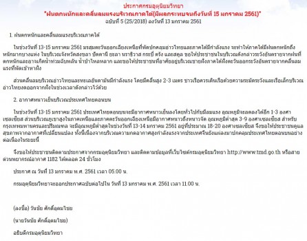 ประกาศกรมอุตุนิยมวิทยา"ฝนตกหนักและคลื่นลมแรงบริเวณภาคใต้(มีผลกระทบจนถึงวันที่ 15 มกราคม 2561)" ฉบับที่ 5 (25/2018) ระบุว่า 1. ฝนตกหนักและคลื่นลมแรงบริเวณภาคใต้ ในช่วงวันที่ 13-15 มกราคมนี้ มรสุมตะวันออกเฉียงเหนือที่พัดปกคลุมอ่าวไทยและภาคใต้ มีกำลังแรง จะทำให้ภาคใต้มีฝนตกหนักถึงหนักมากบางแห่ง ในบริเวณจังหวัดสงขลา ปัตตานี ยะลา นราธิวาส กระบี่ ตรัง และสตูล ขอให้ประชาชนในบริเวณดังกล่าวระวัง อันตรายจากฝนที่ตกหนักและอาจเกิดน้ำท่วมฉับพลัน น้ำป่าไหลหลาก และขอให้ประชาชน ที่อาศัยอยู่บริเวณชายฝั่งภาคใต้ฝั่งตะวันออกระวังอันตรายจากคลื่นลมแรงที่พัดเข้าหาฝั่ง ส่วนคลื่นลมบริเวณอ่าวไทยและทะเลอันดามันมีกำลังแรง โดยมีคลื่นสูง 2-3 เมตร ชาวเรือ ควรเดินเรือด้วยความระมัดระวังและเรือเล็กบริเวณอ่าวไทยงดออกจากฝั่งในช่วงเวลา ดังกล่าวไว้ด้วย 2. อากาศหนาวเย็นบริเวณประเทศไทยตอนบน ในช่วงวันที่ 13-15 มกราคม ประเทศไทย ตอนบนจะมีอากาศหนาวเย็นลงโดยทั่วไปกับมีลมแรง อุณหภูมิจะลดลงได้อีก 1-3 องศา - เซลเซียส ส่วนบริเวณภูเขาสูงในภาคเหนือและภาคตะวันออกเฉียงเหนือมีอากาศหนาว ถึงหนาวจัด อุณหภูมิต่ำสุด 3-9 องศาเซลเซียส สำหรับกรุงเทพมหานครและปริมณฑล จะมีอุณหภูมิต่ำสุดในช่วงวันที่ 13-14 มกราคม อยู่ที่ประมาณ 18-20 องศาเซลเซียส จึงขอให้ประชาชนดูแลสุขภาพจากอากาศที่เปลี่ยนแปลง ทั้งนี้ เนื่องจากบริเวณความ กดอากาศสูงกำลังแรงจากประเทศจีนยังแผ่ลงมาปกคลุมประเทศไทยตอนบนอย่าง ต่อเนื่องในระยะนี้ จึงขอให้ประชาชนติดตามประกาศจากกรมอุตุนิยมวิทยา และติดตามข้อมูลที่เว็บไซต์ กรมอุตุนิยมวิทยา http://www.tmd.go.th หรือสายด่วนพยากรณ์อากาศ 1182 ได้ ตลอด 24 ชั่วโมง