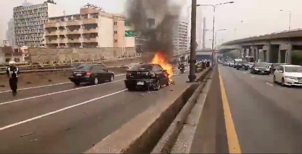 เกิดอุบัติเหตุรถยนต์ชนท้ายกันหลายคัน เมื่อเช้าที่ผ่านมา บริเวณทางด่วนพิเศษขั้นที่ 1 เนินเพลินจิต ฝั่งขาออก มุ่งหน้าจากต่างระดับคลองเตยไปดินแดง และทำให้มีเพลิงใหม้ รถยนต์คันที่ 3 ซึ่งอยู่ตรงกลาง เป็นรถยนต์ส่วนบุคคล ยี่ห้อมาสด้า สีดำ ทะเบียน สท 6354 กรุงเทพมหานคร ต่อมา ร้อยตำรวจโท ทวี เจริญราษฏร์ (มหานคร 61) พร้อมกำลัง และทีมกู้ภัยการทาง พิเศษแห่งประเทศไทย ได้เข้าช่วยเหลือควบคุมเพลิงไว้ได้ ตรวจสอบมีรถยนต์เสียหายจากการเฉี่ยวชน จำนวน 5 คัน แต่ได้รับความเสียหายจาก เพลิงไหม้เพียง 1 คัน และ น.ส.ฐารินี รานิ อายุ 30 ปี ตั้งครรภ์ 6 เดือน ที่โดยสารมากับ รถยนต์คันที่เกิดเพลิงไหม้ มีอาการเจ็บครรภ์ เจ้าหน้าที่จึงรีบนำส่งโรงพยาบาลราชวิถี ทั้งนี้ จากเหตุดังกล่าวต้องปิดการจราจรดำเนินการเคลียร์พื้นที่ จึงทำให้เกิดการ ชะลอตัวสะสม อย่างไรก็ตาม เมื่อเวลา 08.30 น. สามารถเคลื่อนย้ายกีดขวาง เรียบร้อยแล้ว และเปิดการจราจรตามปกติ