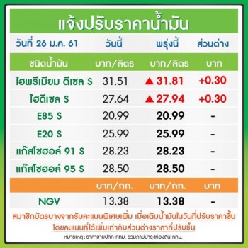 บริษัท ปตท. จำกัด (มหาชน) และบริษัทบางจากคอปอเรชั่น จำกัด (มหาชน) ประกาศปรับขึ้นราคาขายปลีกน้ำมันดีเซลลิตรละ 30 สตางค์ ส่วนกลุ่มเบนซิน และแก๊สโซฮอลคงเดิม มีผลพรุ่งนี้ (27 ม.ค.) เวลา 05.00 น. ซึ่งส่งผลให้ราคาใหม่ เป็นดังนี้ เบนซิน 95 อยู่ที่ลิตรละ 35.56 บาท แก๊สโซฮอล 95 อยู่ที่ 28.45 บาท แก๊สโซฮอล 91 อยู่ที่ 28.18 บาท E20 อยู่ที่ 25.94 บาท E85 อยู่ที่ 20.94 บาท ดีเซล 27.89 บาท ทั้งนี้ ราคาดังกล่าวยังไม่รวมภาษีท้องที่ของแต่ละจังหวัด