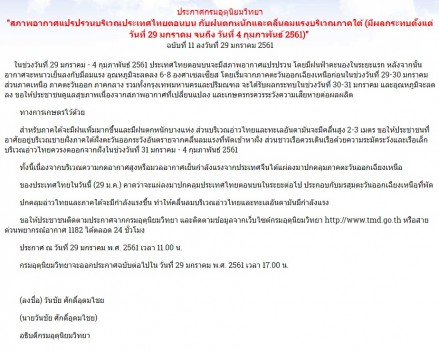 ประกาศกรมอุตุนิยมวิทยา"สภาพอากาศแปรปรวนบริเวณประเทศไทยตอนบน กับฝนตกหนัก และคลื่นลมแรงบริเวณภาคใต้ (มีผลกระทบตั้งแต่วันที่ 29 มกราคม จนถึง วันที่ 4 กุมภาพันธ์ 2561)" ฉบับที่ 11 ระบุว่า ในช่วงวันที่ 29 มกราคม - 4 กุมภาพันธ์ 2561 ประเทศไทยตอนบน จะมีสภาพอากาศแปรปรวน โดยมีฝนฟ้าคะนองในระยะแรก หลังจากนั้น อากาศจะหนาว เย็นลงกับมีลมแรง อุณหภูมิจะลดลง 6-8 องศาเซลเซียส โดยเริ่มจากภาคตะวันออกเฉียง - เหนือก่อน ในช่วงวันที่ 29-30 มกราคม ส่วนภาคเหนือ ภาคตะวันออก ภาคกลาง รวมทั้งกรุงเทพมหานครและปริมณฑล จะได้รับผลกระทบในช่วงวันที่ 30-31 มกราคม และอุณหภูมิจะลดลง ขอให้ประชาชนดูแลสุขภาพเนื่องจากสภาพอากาศที่เปลี่ยนแปลง และเกษตรกร ควรระวังความเสียหายต่อผลผลิตทางการเกษตรไว้ด้วย สำหรับภาคใต้จะมีฝนเพิ่มมากขึ้นและมีฝนตกหนักบางแห่ง ส่วนบริเวณอ่าวไทยและ ทะเลอันดามันจะมีคลื่นสูง 2-3 เมตร ขอให้ประชาชนที่อาศัยอยู่บริเวณชายฝั่งภาคใต้ ฝั่งตะวันออกระวังอันตรายจากคลื่นลมแรงที่พัดเข้าหาฝั่ง ส่วนชาวเรือควรเดินเรือด้วยความระมัดระวังและเรือเล็กบริเวณอ่าวไทยควรงดออกจากฝั่ง ในช่วงวันที่ 31 มกราคม – 4 กุมภาพันธ์ ทั้งนี้ เนื่องจากบริเวณความกดอากาศสูงหรือมวลอากาศเย็นกำลังแรงจากประเทศจีน ได้แผ่ลงมาปกคลุมภาคตะวันออกเฉียงเหนือของประเทศไทยในวันนี้ คาดว่าจะแผ่ ลงมาปกคลุมประเทศไทยตอนบนในระยะต่อไป ประกอบกับมรสุมตะวันออกเฉียงเหนือ ที่พัดปกคลุมอ่าวไทยและภาคใต้จะมีกำลังแรงขึ้น ทำให้คลื่นลมบริเวณอ่าวไทยและ ทะเลอันดามันมีกำลังแรง ขอให้ประชาชนติดตามประกาศจากกรมอุตุนิยมวิทยา และติดตามข้อมูลจากเว็บไซต์ กรมอุตุนิยมวิทยา http://www.tmd.go.th หรือสายด่วนพยากรณ์อากาศ 1182 ได้ตลอด 24 ชั่วโมง