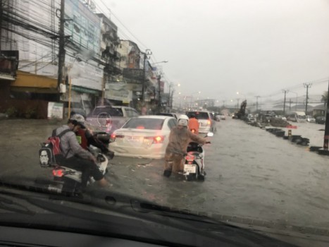 ฝนที่ตกลงมาอย่างหนักหลายจุดในพื้นที่กรุงเทพมหานครตั้งแต่ช่วงเช้ามืด ส่งผลให้เช้าวันนี้ การจราจรติดขัดอย่างหนักในหลายพื้นที่ มีรายงานว่า ถนนศรีนครินทร์ ตั้งแต่ช่วงขาออก แยกแบริ่งตัดศรีนครินทร์ รถมากท้ายแถวหน้าโลตัส บริเวณแยกศรีเทพา มีน้ำท่วมสูง ทุกช่องจราจร "รถติดขัดมาก" แยกเทพารักษ์ ไปสำโรง น้ำท่วมทุกช่องทาง ตั้งแต่เวลา 05.00 น. เรดาร์ตรวจอากาศของสำนักการระบายน้ำกรุงเทพมหานคร ตรวจพบกลุ่มฝนตกหนักในพื้นที่เขตพระประแดง จ.สมุทรปราการ ก่อนเคลื่อนตัวเข้าเขตสำโรง บางนา ประเวศ พระโขนง และกลุ่มฝนได้ตกอยู่ในพื้นที่แบบไม่เคลื่อนตัวกว่า 1 ชม. วัดปริมาณน้ำฝนได้กว่า 100 มม. ที่เขตบางนา ทำให้เกิดน้ำท่วมขังหลายจุด ได้แก่ ถ.ศรีนครินทร์ ถ.เทพรัตน ถ.สุขุมวิท ถ.ปู่เจ้าสมิงพราย การจราจรในช่วงเช้าติดขัดอย่างหนัก