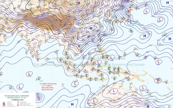 ประกาศกรมอุตุนิยมวิทยา "อากาศหนาวเย็นบริเวณประเทศไทยตอนบน และคลื่นลมแรง บริเวณภาคใต้ (มีผลกระทบตั้งแต่วันที่ 5 จนถึง วันที่ 8 กุมภาพันธ์ 2561 " ฉบับที่ 12 ช่วงวันที่ 5-8 กุมภาพันธ์นี้ บริเวณประเทศไทยตอนบน จะมีอุณหภูมิลดลงได้อีก 4-6 องศาเซลเซียส ทำให้ภาคเหนือและภาคตะวันออกเฉียงเหนือมีอากาศหนาวถึงหนาวจัด และมีน้ำค้างแข็งเกิดขึ้นได้บางพื้นที่ตามภูเขาสูงในบริเวณภาคเหนือ ส่วนภาคกลาง ภาคตะวันออก รวมทั้ง กรุงเทพมหานครและปริมณฑลมีอากาศหนาวเย็นอย่างต่อเนื่อง ทั้งนี้ เนื่องจากบริเวณความกดอากาศสูงกำลังแรงจากประเทศจีนคลุมประเทศไทย ประกอบกับมีลมตะวันตกในระดับบนพัดปกคลุมภาคเหนือ ขอให้ประชาชนบริเวณ ประเทศไทยตอนบน ดูแลรักษาสุขภาพเนื่องจากสภาพอากาศที่เปลี่ยนแปลง เกษตรกร ควรระวังความเสียหายต่อผลผลิตทางการเกษตรไว้ด้วย สำหรับมรสุมตะวันออกเฉียงเหนือที่พัดปกคลุมอ่าวไทยและภาคใต้มีกำลังแรง ทำให้ คลื่นลมบริเวณอ่าวไทยและทะเลอันดามัน มีกำลังแรง โดยมีคลื่นสูง 2-3 เมตร ขอให้ ประชาชนที่อาศัยอยู่บริเวณชายฝั่งภาคใต้ฝั่งตะวันออก ระวังอันตรายจากคลื่นลมแรง ที่พัดเข้าหาฝั่ง ส่วนชาวเรือควรเดินเรือด้วยความระมัดระวังและเรือเล็กบริเวณอ่าวไทย ควรงดออกจากฝั่ง ขอให้ประชาชนติดตามประกาศจากกรมอุตุนิยมวิทยา และติดตามข้อมูลจากเว็บไซต์ กรมอุตุนิยมวิทยา http://www.tmd.go.th หรือสายด่วนพยากรณ์อากาศ 1182 ได้ตลอด 24 ชั่วโมง