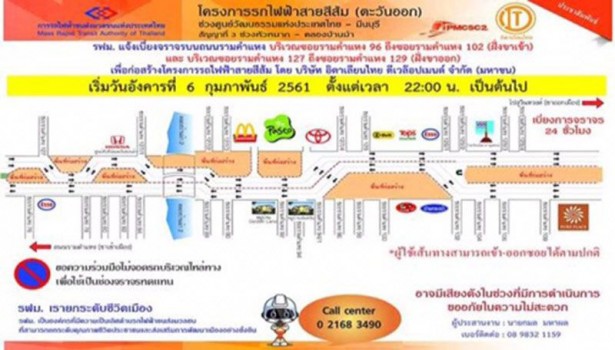 การรถไฟฟ้าขนส่งมวลชนแห่งประเทศไทย หรือ รฟม. แจ้งว่า บริษัท อิตาเลียนไทย ดีเวล๊อปเมนต์ จำกัด (มหาชน) ผู้รับจ้างก่อสร้างงานโยธาอุโมงค์ทางวิ่ง และสถานีใต้ดิน สัญญาที่ 3 ช่วงหัวหมาก - คลองบ้านม้า มีความจำเป็นต้องเบี่ยงการจราจร เพื่อ ก่อสร้างโครงการรถไฟฟ้าสายสีส้ม (ตะวันออก) ช่วงศูนย์วัฒนธรรมแห่งประเทศไทย – มีนบุรี โดยมีรายละเอียดการจัดการจราจรดังนี้ - บริเวณซอยรามคำแหง 96 - 102 (ขาเข้า) ปิดเบี่ยงจราจรฝั่งขาเข้า 3 ช่องทาง และ เบี่ยงมาใช้ฝั่งขาออก 2 ช่องทางทดแทน - บริเวณซอยรามคำแหง 127 - 129 (ขาออก) สลับการเบี่ยงจราจรเหลือ 2 ช่องจราจร โดยผู้ใช้เส้นทางสามารถเข้า - ออกซอยในบริเวณดังกล่าวได้ตามปกติ และในระหว่างดำเนินการก่อสร้าง มีแผนการจัดการจราจร เช่น ห้ามจอดรถบริเวณไหล่ทางตลอด แนวก่อสร้าง เพื่อใช้เป็นช่องจราจรทดแทน ปรับผิวจราจรและตีเส้นช่องจราจรให้ชัดเจน ติดตั้งป้ายเตือนและไฟส่องสว่างเพื่อความปลอดภัยของผู้ใช้เส้นทาง รวมถึงการ ประชาสัมพันธ์แจ้งให้ผู้ใช้เส้นทางรับทราบ ทั้งนี้ การเบี่ยงการจราจรเพื่อดำเนินการก่อสร้าง อาจไม่ได้รับความสะดวกในการเดินทาง และอาจมีเสียงดังรบกวนในวันและเวลาดังกล่าว ดังนั้น หากไม่มีความจำเป็นโปรดหลีกเลี่ยงเส้นทาง และ รฟม.ต้องขออภัยมา ณ โอกาสนี้