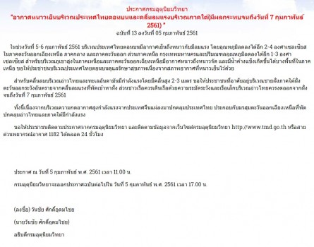 ประกาศกรมอุตุนิยมวิทยา "อากาศหนาวเย็นบริเวณประเทศไทยตอนบนและ คลื่นลมแรงบริเวณภาคใต้ มีผลกระทบจนถึงวันที่ 7 กุมภาพันธ์ 2561" ฉบับที่ 13 ช่วงวันที่ 5-6 กุมภาพันธ์ บริเวณประเทศไทยตอนบน มีอากาศเย็นถึงหนาวกับมีลมแรง อุณหภูมิลดลงได้อีก 2-4 องศาเซลเซียสในภาคตะวันออกเฉียงเหนือ ภาคกลาง และ ภาคตะวันออก ส่วนภาคเหนือ กรุงเทพมหานครและปริมณฑล อุณหภูมิลดลงได้อีก 1-3 องศาเซลเซียส สำหรับบริเวณภูเขาสูงในภาคเหนือและภาคตะวันออกเฉียงเหนือ มีอากาศหนาวถึงหนาวจัด และมีน้ำค้างแข็งเกิดขึ้นได้บางพื้นที่ในภาคเหนือ ขอให้ ประชาชนบริเวณประเทศไทยตอนบนดูแลรักษาสุขภาพเนื่องจากสภาพอากาศ ที่หนาวเย็นไว้ด้วย สำหรับคลื่นลมบริเวณอ่าวไทยและทะเลอันดามันมีกำลังแรงโดยมีคลื่นสูง 2-3 เมตร ขอให้ประชาชนที่อาศัยอยู่บริเวณชายฝั่งภาคใต้ฝั่งตะวันออกระวังอันตรายจากคลื่นลมแรง ที่พัดเข้าหาฝั่ง ส่วนชาวเรือควรเดินเรือด้วยความระมัดระวังและเรือเล็กบริเวณอ่าวไทย ควรงดออกจากฝั่งจนถึงวันที่ 7 กุมภาพันธ์ ทั้งนี้ เนื่องจากบริเวณความกดอากาศสูงกำลังแรงจากประเทศจีน แผ่ลงมาปกคลุม ประเทศไทย ประกอบกับมรสุมตะวันออกเฉียงเหนือที่พัดปกคลุมอ่าวไทยและภาคใต้ มีกำลังแรง ขอให้ประชาชนติดตามประกาศจากกรมอุตุนิยมวิทยา และติดตามข้อมูลจากเว็บไซต์ กรมอุตุนิยมวิทยา http://www.tmd.go.th หรือสายด่วนพยากรณ์อากาศ 1182 ได้ตลอด 24 ชั่วโมง