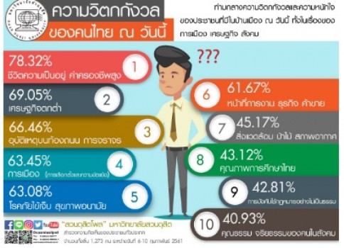 สวนดุสิตโพล มหาวิทยาลัยสวนดุสิต เปิดเผยผลสำรวจความคิดเห็นประชาชน เรื่อง “ความวิตกกังวลของคนไทย ณ วันนี้” จากประชาชน 1,273 คน ระหว่างวันที่ 6-10 ก.พ. พบว่า เรื่องที่ประชาชนมีความกังวลสูงที่สุด อันดับหนึ่ง ร้อยละ 78.32 ชีวิตความเป็นอยู่ ปากท้อง เงินไม่พอใช้ รายได้ไม่พอกับรายจ่าย ค่าครองชีพสูง ของกิน-ของใช้แพง เห็นว่าควรแก้โดยการประหยัด กินใช้อย่างพอเพียง ทำงานหารายได้เพิ่ม กู้ยืม หมุนเงิน รัฐบาลช่วยเหลือ เร่งแก้ไขปัญหา อันดับ 2 ร้อยละ 69.05 เศรษฐกิจตกต่ำ การค้าการลงทุนไม่ดี คนตกงาน ต่างชาติไม่ลงทุน คนไม่มีกำลังซื้อ เห็นว่าควรแก้โดยให้รัฐกระตุ้นเศรษฐกิจ ส่งเสริมการลงทุน ธนาคารให้กู้ยืมดอกเบี้ยต่ำ ยกเว้นภาษี เร่งจัดการเลือกตั้ง อันดับ 3 ร้อยละ 66.46 อุบัติเหตุบนท้องถนน การจราจร เห็นว่าควรแก้โดยการช่วยกันรณรงค์ กระตุ้นให้เกิดจิตสำนึก ปฏิบัติตามกฎจราจร เมาไม่ขับ ขับรถอย่างมีสติ ไม่ประมาท