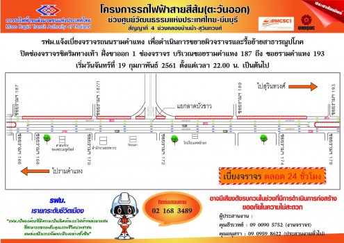 การรถไฟฟ้าขนส่งมวลชนแห่งประเทศไทย หรือ รฟม.แจ้งว่า บริษัท ยูนิค เอ็นจิเนียริ่ง แอนด์ คอนสตรัคชั่น จำกัด (มหาชน) ผู้รับจ้างงานก่อสร้างโครงสร้างทางวิ่งยกระดับ สัญญาที่ 4 ช่วงคลองบ้านม้า-สุวินทวงศ์ โครงการรถไฟฟ้าสายสีส้ม (ตะวันออก) ช่วงศูนย์วัฒนธรรมแห่งประเทศไทย - มีนบุรี มีความจำเป็นต้องเบี่ยงจราจรบนถนน รามคำแหง เพื่อดำเนินการขยายผิวจราจรและรื้อย้ายสาธารณูปโภค บริเวณ ซอยรามคำแหง 187 ถึงซอยรามคำแหง 193 จึงมีความจำเป็นต้องเบี่ยงจราจร ถนนรามคำแหง ในบริเวณดังกล่าว โดยจะปิดช่องจราจรชิดริมทางเท้า ฝั่งขาออก ถนนรามคำแหง 1 ช่องจราจร ตลอด 24 ชั่วโมง ตั้งแต่วันจันทร์ที่ 19 กุมภาพันธ์นี้ ตั้งแต่เวลา 22.00 น. เป็นต้นไป