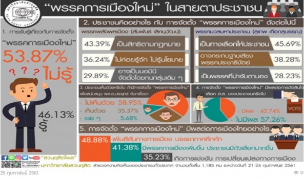 สวนดุสิตโพล มหาวิทยาลัยสวนดุสิต สำรวจความคิดเห็นประชาชนทั่วประเทศ 1,185 คน ระหว่างวันที่ 21-24 กุมภาพันธ์ เกี่ยวกับกระแสข่าวการตั้งพรรคการเมืองใหม่ ส่งผลให้บรรยากาศทางการเมืองไทยคึกคัก โดยเฉพาะการจัดตั้งพรรคใหม่ของ นายสุเทพ เทือกสุบรรณ ที่ถูกจับตาและเป็นที่วิพากษ์วิจารณ์อย่างกว้างขวาง โดยพบว่า ประชาชน ร้อยละ 53.87 ไม่รู้ว่าจะมีการตั้งพรรคการเมืองใหม่ เนื่องจากไม่ได้ติดตามข่าวสารการเมือง ส่วนที่เหลือรู้ ประชาชน ร้อยละ 58.95 ไม่เห็นด้วย หากมีการตั้งพรรคใหม่เพื่อสนับสนุน พลเอกประยุทธ์ จันทร์โอชา เพราะพรรคการเมืองควรเป็นอิสระ เป็นกลาง มีนโยบายชัดเจน เน้นทำเพื่อประชาชน พัฒนาบ้านเมือง ไม่ควรสนับสนุนใคร ที่เป็นการสืบทอดอำนาจ ส่วนที่เห็นด้วยมี ร้อยละ 35.37 ขณะที่ ร้อยละ 5.68 เฉยๆ