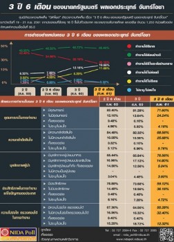 ศูนย์สำรวจความคิดเห็น สถาบันบัณฑิตพัฒนบริหารศาสตร์ (นิด้า) เปิดเผยผลสำรวจความคิดเห็นประชาชน เรื่อง “3 ปี 6 เดือน ของนายกรัฐมนตรี พลเอกประยุทธ์ จันทร์โอชา ระหว่างวันที่ 19-21 ก.พ. จากประชาชนอายุ 18 ปี ขึ้นไปทั่วประเทศ กระจายทุกระดับการศึกษา และอาชีพ รวม 1,250 หน่วยตัวอย่าง เกี่ยวกับความพึงพอใจต่อการทำงานของนายกรัฐมนตรี พลเอกประยุทธ์ จันทร์โอชา และคณะรัฐมนตรี เมื่อถามถึงความคิดเห็นที่มีต่อการดำรงตำแหน่งครบ 3 ปี 6 เดือน ของนายกรัฐมนตรี พลเอกประยุทธ์ จันทร์โอชา พบว่า ประชาชน ร้อยละ 20.16 ระบุว่า ทำงานในตำแหน่งได้ดีมาก เพราะมีการแก้ไขปรับเปลี่ยนระบบการบริหารงานได้ดี มีความเด็ดขาดในการทำงาน มีความโปร่งใส มุ่งหวังพัฒนาประเทศ และพร้อมจะช่วยเหลือประชาชน ขณะที่ ร้อยละ 19.68 ระบุว่า ไม่ค่อยดี เพราะยังมีจุดบกพร่อง เกิดความขัดแย้ง เศรษฐกิจไม่ดี ไม่สามารถแก้ไขปัญหาเศรษฐกิจได้ ร้อยละ 11.68 เห็นว่าไม่ดีเลย เพราะบ้านเมืองยังไม่มีการเปลี่ยนแปลงไปจากเดิม การบริหารงานต่าง ๆ ล่าช้า ไม่สามารถทำตาม Road map ได้ ไม่โปร่งใส เลือกพวกพ้อง ไม่มีความเสมอภาค และเศรษฐกิจย่ำแย่ และร้อยละ 0.32 ไม่ระบุ/ไม่แน่ใจ เมื่อเปรียบเทียบกับผลการสำรวจ เมื่อเดือนสิงหาคม 2560 พบว่า เมื่อรวมสัดส่วนของผู้ที่ระบุว่า ทำงานได้ค่อนข้างดีและดีมาก พบว่า มีสัดส่วนลดลง ขณะที่ผู้ที่ระบุว่า ทำงานได้ไม่ค่อยดี จนถึงระดับไม่ดีเลย มีสัดส่วนเพิ่มขึ้น