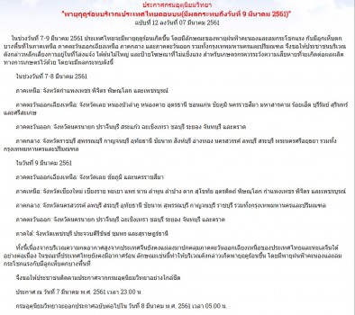 ประกาศกรมอุตุนิยมวิทยา "พายุฤดูร้อนบริเวณประเทศไทยตอนบน(มีผลกระทบถึงวันที่ 9 มีนาคม 2561)" ฉบับที่ 13 ช่วงวันที่ 8-9 มีนาคม ประเทศไทยจะมีพายุฤดูร้อนเกิดขึ้น โดยมีลักษณะของพายุฝนฟ้าคะนองและลมกระโชกแรง กับมีลูกเห็บตกบางพื้นที่ในภาคเหนือ ภาคตะวันออกเฉียงเหนือ ภาคกลาง และภาคตะวันออก รวมทั้งกรุงเทพมหานครและปริมณฑล จึงขอให้ประชาชนบริเวณดังกล่าวหลีกเลี่ยงการอยู่ในที่โล่งแจ้ง ใต้ต้นไม้ใหญ่ และป้ายโฆษณาที่ไม่แข็งแรง สำหรับเกษตรกรควรระวังความเสียหายที่จะเกิดต่อผลผลิตทางการเกษตรไว้ด้วย โดยจะมีผลกระทบดังนี้ วันที่ 8 มีนาคม ภาคเหนือ: จังหวัดกำแพงเพชร พิจิตร พิษณุโลก และเพชรบูรณ์ ภาคตะวันออกเฉียงเหนือ: จังหวัดเลย หนองบัวลำภู หนองคาย อุดรธานี ขอนแก่น ชัยภูมิ นครราชสีมา มหาสารคาม ร้อยเอ็ด บุรีรัมย์ สุรินทร์ และศรีสะเกษ ภาคตะวันออก: จังหวัดนครนายก ปราจีนบุรี สระแก้ว ฉะเชิงเทรา และชลบุรี ภาคกลาง: จังหวัดราชบุรี สุพรรณบุรี กาญจนบุรี อุทัยธานี ชัยนาท สิงห์บุรี อ่างทอง นครสวรรค์ ลพบุรี สระบุรี พระนครศรีอยุธยา รวมทั้งกรุงเทพมหานครและปริมณฑล วันที่ 9 มีนาคม ภาคตะวันออกเฉียงเหนือ: จังหวัดเลย ชัยภูมิ และนครราชสีมา ภาคเหนือ: จังหวัดเชียงใหม่ เชียงราย พะเยา แพร่ น่าน ลำพูน ลำปาง ตาก สุโขทัย อุตรดิตถ์ พิษณุโลก กำแพงเพชร พิจิตร และเพชรบูรณ์ ภาคกลาง: จังหวัดนครสวรรค์ ลพบุรี สระบุรี อุทัยธานี ชัยนาท สุพรรณบุรี กาญจนบุรี ราชบุรี รวมทั้งกรุงเทพมหานครและปริมณฑล ภาคตะวันออก: จังหวัดนครนายก ปราจีนบุรี ฉะเชิงเทรา ชลบุรี ระยอง จันทบุรี และตราด ภาคใต้: จังหวัดเพชรบุรี ประจวบคีรีขันธ์ ชุมพร และสุราษฎร์ธานี เนื่องจากบริเวณความกดอากาศสูงจากประเทศจีนยังคงแผ่ลงมาปกคลุมภาคตะวันออกเฉียงเหนือ และทะเลจีนใต้ต่อเนื่อง ขณะที่ประเทศไทยยังคงมีอากาศร้อน ทำให้บริเวณดังกล่าวเกิดพายุฤดูร้อนขึ้น โดยมีพายุฝนฟ้าคะนองและลมกระโชกแรงกับมีลูกเห็บตกบางพื้นที่ จึงขอให้ประชาชนติดตามประกาศจากกรมอุตุนิยมวิทยาอย่างใกล้ชิด