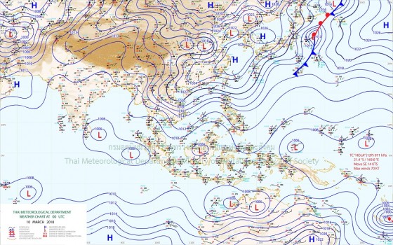 กรมอุตุนิยมวิทยาพยากรณ์อากาศ 24 ชั่วโมงข้างหน้า บริเวณประเทศไทยตอนบน มีฝนลดลง เว้นแต่ภาคเหนือยังคงมีฝนฟ้าคะนองบางพื้นที่ จึงขอให้เกษตรกรควรระวัง ความเสียหายที่จะเกิดต่อผลผลิตทางการเกษตรไว้ด้วย สำหรับภาคใต้มีฝนเพิ่มขึ้น โดยอ่าวไทยตอนล่างมีคลื่นสูงประมาณ 2 เมตร ขอให้ชาวเรือบริเวณดังกล่าวเดินเรือ ด้วยความระมัดระวังในระยะ 1-2 วันนี้ สำหรับกรุงเทพฯ และปริมณฑล มีเมฆบางส่วน กับมีฝนฟ้าคะนอง ร้อยละ 10 ของพื้นที่