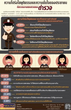 ศูนย์สำรวจความคิดเห็น “นิด้าโพล” สถาบันบัณฑิตพัฒนบริหารศาสตร์ เปิดเผยผลสำรวจความคิดเห็นประชาชน เรื่อง “ความโปร่งใสยุติธรรมและความมั่นใจของประชาชนต่อระบบงานสอบสวนของตำรวจ” ระหว่างวันที่ 1-6 มี.ค. จากประชาชนที่มีอายุ 18 ปีขึ้นไป กระจายทุกภูมิภาค ระดับการศึกษา และอาชีพทั่วประเทศ รวม 1,250 หน่วยตัวอย่าง พบว่า ร้อยละ 35.20 ระบุว่า การสอบสวนของตำรวจไม่ค่อยโปร่งใสยุติธรรม เพราะเกิดความล่าช้า มีข้อผิดพลาดค่อนข้างบ่อย มีผลประโยชน์เข้ามาเกี่ยวข้อง และใช้ระบบพวกพ้อง ขณะที่ร้อยละ 14.64 ระบุว่า ไม่มีความโปร่งใสยุติธรรมเลย เพราะประชาชนไม่สามารถเข้าไปตรวจสอบหรือมีส่วนร่วมในการสอบสวนได้ บางครั้งหลักฐานไม่ชัดเจน ชอบยัดข้อหาให้คนจน ถูกแทรกแซงการทำงานจากผู้มีอิทธิพล และเรื่องของผลประโยชน์เข้ามาเกี่ยวข้อง มีเพียง ร้อยละ 9.68 ที่ระบุว่ามีความโปร่งใสยุติธรรมมาก และร้อยละ 39.60 ค่อนข้างโปร่งใสยุติธรรม ส่วนความมั่นใจต่อขั้นตอนการดำเนินคดีและระบบงานสอบสวนของตำรวจ ร้อยละ 40.56 ระบุว่า ไม่ค่อยมั่นใจ เพราะใช้ระบบพวกพ้อง มีผู้มีอิทธิพลเข้ามาแทรกแซงการทำงาน และมีเรื่องของผลประโยชน์เข้ามาเกี่ยวข้อง ร้อยละ 10.72 ไม่มั่นใจเลย เพราะมีอำนาจของเงินเข้ามาเกี่ยวข้อง คนรวยมักหลุดพ้นคดี มีเพียงร้อยละ 11.12 ที่มั่นใจมาก และร้อยละ 37.20 ระบุว่า ค่อนข้างมั่นใจ เพราะมีระบบการทำงาน ที่ค่อนข้างละเอียดอยู่แล้ว ปฏิบัติตามกฎ ระเบียบ และหลักฐานที่มี เมื่อถามถึงแนวทางในการปรับปรุงงานสอบสวนให้มีประสิทธิภาพยิ่งขึ้น ประชาชนส่วนใหญ่ ร้อยละ 41.52 ระบุ ควรบันทึกเสียงและภาพระหว่างการสอบสวน เพื่อลดความผิดพลาดและเพิ่มความโปร่งใส รองลงมา ส่งเสริมด้านการมีจริยธรรมและจรรยาบรรณของตำรวจ กระจายอำนาจการสอบสวนไปให้หน่วยงานที่มีความเชี่ยวชาญเฉพาะด้าน ให้พนักงานอัยการ มีบทบาทในกระบวนการสอบสวนคดีอาญาร่วมกับพนักงานสอบสวน ควรให้หน่วยงานภายนอกหรือหน่วยงานที่เกี่ยวข้องเข้ามามีส่วนร่วมในการตรวจสอบ แยกหน่วยงานสอบสวนออกจากตำรวจ