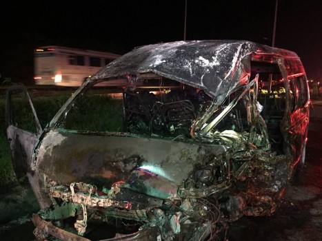 รถตู้โดยสารไม่ประจำทาง ทะเบียน 33-1531 กทม. ชนท้ายรถบรรทุก 18 ล้อบรรทุกแร่ บนถนนสายเอเชีย ช่วงกิโลเมตรที่ 77+400 อำเภอพรหมบุรี จังหวัดสิงห์บุรี เมื่อกลางดึก ที่ผ่านมา โดยรถตู้เกิดไฟลุกไหม้เสียหายทั้งคัน มีผู้เสียชีวิต 3 ราย ติดภายในถูกไฟคลอก และมีผู้บาดเจ็บ 8 คน เจ้าหน้าที่นำส่งโรงพยาบาลพรหมบุรี 2 คน และโรงพยาบาล สิงห์บุรี 6 คน ส่วนที่ถนนสาย 347 ปทุมธานี – บางปะหัน รถกระบะ เสียหลักชนต้นมะขามเทศ ร่องกลางถนน ต้นไม้ล้มทับตัวรถอยู่สภาพพังยับเยิน ทำให้ม้วนสายเคเบิ้ลขนาดใหญ่ 3 ม้วน ร่วงตกหล่น มีผู้เสียชีวิตยกคัน 3 ราย เป็นผู้ชายทั้งหมด เจ้าหน้าที่นำศพส่ง โรงพยาบาลธรรมศาสตร์เฉลิมพระเกียรติ เจ้าหน้าที่ตำรวจ คาดว่า รถน่าจะมาด้วยความเร็ว เมื่อมาถึงที่เกิดเหตุ คนขับอาจหลับใน จนรถเสียหลัก ไถลพุ่งชนต้นไม้อย่างแรง แต่ยังไม่แน่ชัดว่ารถคันนี้กำลังนำสายเคเบิ้ลไปที่ใด ต้องรอสอบถามกับผู้ครอบครองรถ รวมทั้งญาติผู้เสียชีวิต นอกจากนี้ บริเวณถนนกาญจนาภิเษก (วงแหวนตะวันตก) ช่วงต่างระดับเอกชัย มุ่งหน้าต่างระดับบางโคลัด เยื้องกับโรงเรียนเลิศหล้า มีรถเก๋งชนขอบทาง ส่งผลให้ มีผู้เสียชีวิต 2 ราย ( ภาพ FB. ข่าวสดonline new ( จิตข่าวอาสา)