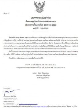 ประกาศกรมอุตุนิยมวิทยา "พายุฤดูร้อนบริเวณประเทศไทยตอนบน (มีผลกระทบตั้งแต่วันที่ 20-23 มีนาคม 2561)" ฉบับที่ 3 ลงวันที่ 18 มีนาคม ช่วงวันที่ 20-23 มีนาคม 2561 ประเทศไทยตอนบนจะมีพายุฤดูร้อนเกิดขึ้น โดยมีลักษณะของพายุฝนฟ้าคะนอง ลมกระโชกแรง กับมีลูกเห็บตกบางพื้นที่ รวมถึงฟ้าผ่า โดยภาคตะวันออกเฉียงเหนือ และภาคตะวันออก จะมีผลกระทบในวันที่ 20 มีนาคม 2561 ส่วนภาคเหนือ ภาคกลาง รวมทั้งกรุงเทพมหานครและปริมณฑล จะเริ่มได้รับผลกระทบในวันถัดไป (วันที่ 21 มีนาคม) จึงขอให้ประชาชนในบริเวณดังกล่าวระวังอันตรายจากพายุฤดูร้อนที่จะเกิดขึ้น โดยหลีกเลี่ยงการอยู่ในที่โล่งแจ้ง ใต้ต้นไม้ใหญ่ และป้ายโฆษณาที่ไม่แข็งแรง รวมถึงระวังอันตรายจากฟ้าผ่า สำหรับเกษตรกรควรเตรียมการป้องกันและระวังความเสียหายที่จะเกิดต่อผลผลิตทางการเกษตรไว้ด้วย เนื่องจากบริเวณความกดอากาศสูงจากประเทศจีนจะแผ่ลงมาปกคลุมประเทศไทยตอนบนและทะเลจีนใต้ ในขณะที่ประเทศไทยมีอากาศร้อน ทำให้บริเวณดังกล่าวจะมีพายุฤดูร้อนเกิดขึ้น โดยจะเริ่มแผ่ลงมาปกคลุมบริเวณภาคตะวันออกเฉียงเหนือและภาคตะวันออกก่อน จึงขอให้ประชาชนติดตามประกาศจากกรมอุตุนิยมวิทยาอย่างใกล้ชิด