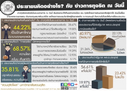 สวนดุสิตโพล มหาวิทยาลัยสวนดุสิต เปิดเผยผลสำรวจความคิดเห็นประชาชนทั่วประเทศ 1,157 คน ระหว่างวันที่ 13-17 มี.ค. ในหัวข้อ “ประชาชนคิดอย่างไรกับข่าวทุจริต ณ วันนี้” หลังจากที่มีข่าวออกมาให้เห็นอย่างต่อเนื่อง เช่น ทุจริตโครงการเงินช่วยเหลือผู้ยากไร้ เงินเบี้ยเลี้ยงตำรวจตระเวนชายแดน พบว่า ร้อยละ 44.22 เห็นว่าเป็นปัญหาใหญ่ที่มีมานานทุกยุคทุกสมัย สร้างความเสียหายต่อประเทศ ร้อยละ 28.67 เห็นว่าอยากให้แก้ปัญหาอย่างจริงจัง มีการตรวจสอบ รื้อระบบภาครัฐครั้งใหญ่ และร้อยละ 19.00 เห็นว่าเป็นแบบอย่างที่ไม่ดี กระทบต่อภาพลักษณ์ ชื่อเสียงของรัฐบาล ส่วนคิดว่าการทุจริตมีสาเหตุจากอะไร ร้อยละ 68.57 เห็นว่าเป็นความโลภเห็นแก่ตัว ขาดจิตสำนึก ร้อยละ 26.72 เห็นว่า การใช้อำนาจหน้าที่เอารัดเอาเปรียบ และร้อยละ 19.29 เห็นว่าระบบการตรวจสอบ ติดตาม ไม่เข้มแข็ง สำหรับแนวทางป้องกันปัญหาการทุจริตจะทำอย่างไร ร้อยละ 35.81 ระบุว่า ควรปลูกฝังจริยธรรม ความซื่อสัตย์ ร้อยละ 35.42 ควรมีระบบการตรวจสอบที่ละเอียด เข้มงวด และรัดกุม ร้อยละ 32.10 ควรพัฒนาเศรษฐกิจ การศึกษา สร้างคุณภาพชีวิตที่ดี เมื่อถามว่า ข่าวการทุจริตวันนี้ มีผลต่อความเชื่อมั่นของประชาชนที่มีต่อรัฐบาล พล.อ.ประยุทธ์ จันทร์โอชา มากน้อยเพียงใด ร้อยละ 40.97 เห็นว่า มีผลมาก เพราะกระทบต่อภาพลักษณ์ ขาดความน่าเชื่อถือ ถูกมองว่าเป็นการปกป้องพวกพ้อง รู้สึกผิดหวัง ร้อยละ 22.13 ค่อนข้างมีผล เพราะแสดงให้เห็นถึงการทำงานที่ไม่มีประสิทธิภาพ ไม่สามารถแก้ปัญหาได้ ยังมีปัญหาเกิดขึ้นอย่างต่อเนื่อง และร้อยละ 21.26 เห็นว่า ไม่ค่อยมีผล เพราะการทุจริตเป็นปัญหาที่ฝังรากลึก มีมานาน ทุกรัฐบาลประสบปัญหา ไม่คาดหวังกับการแก้ปัญหาการทุจริตอยู่แล้ว และเมื่อถามว่า ประชาชนคิดว่ารัฐบาลพล.อ.ประยุทธ์ จะแก้ปัญหาการทุจริตได้หรือไม่ ร้อยละ 56.61 เห็นว่าแก้ไขไม่ได้ เพราะที่ผ่านมามีหลายคดีที่เงียบหายไป ไม่สามารถเอาผิดได้ เป็นปัญหาเรื้อรัง ร้อยละ 23.42 ไม่แน่ใจ เพราะต้องใช้เวลาในการแก้ปัญหา ทุกฝ่ายต้องช่วยกัน ยังไม่รู้ข้อมูลข้อเท็จจริง ต้องติดตามต่อไป ส่วนที่เห็นว่าแก้ไขได้ มีเพียงร้อยละ 19.97 เพราะรัฐบาล คสช.มีอำนาจพิเศษสามารถแก้ปัญหาได้อย่างรวดเร็ว เป็นปัญหาที่อยู่ในความสนใจของประชาชน