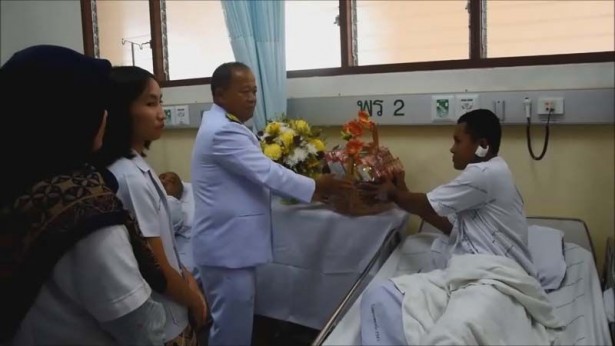 วันนี้ เวลา 14.00 น. ที่โรงพยาบาลตากใบ จังหวัดนราธิวาส สมเด็จพระเจ้าอยู่หัว ทรงพระกรุณาโปรดเกล้าโปรดกระหม่อมให้ นายสุรพร พร้อมมูล ผู้ว่าราชการจังหวัด นราธิวาส เชิญดอกไม้และตะกร้าสิ่งของพระราชทานไปมอบให้ อาสาสมัคร แวมะอัสรีย์ ตระกูลสรณคมน์ อายุ 28 ปี รองหัวหน้าชุดปฏิบัติการณ์ ร้อยทหารพรานที่ 4502 กรมทหารพรานที่ 45 และอาสาสมัครทหารพราน ธวัช นาโสภา อายุ 28 ปี พลปืนเล็ก ร้อยทหารพรานที่ 4502 กรมทหารพรานที่ 45 ที่ได้รับบาดเจ็บจากถูกคนร้ายซุ่มยิง ขณะนั่งพักผ่อนภายในอาคารเรียนของโรงเรียนบ้านตะเหลี่ยง หมู่ 4 ต.เกาะสะท้อน อ.ตากใบ จ.นราธิวาส หลังจากที่ได้ร่วมกับกำลังพลเดินลาดตระเวนจรยุทธ์ในการ ตรวจสอบความเรียบร้อย และให้การรักษาความปลอดภัยแก่ชีวิตของพี่น้องประชาชน ในยามค่ำคืน เหตุเกิดเมื่อวันที่ 23 มี.ค.2561 ทั้งนี้ เพื่อเป็นขวัญกำลังใจ ยังความปลื้มปิติแก่ อาสาสมัคร แวมะอัสรีย์ ตระกูลสรณคมน์ และอาสาสมัคร ทหารพราน ธวัช นาโสภา และครอบครัว ด้วยสำนึกในพระมหากรุณาธิคุณ อย่างหาที่สุดมิได้ ( ขอบคุณภาพ จากแนวหน้า)