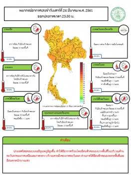 พยากรณ์อากาศ 24 ชั่วโมงข้างหน้า ประเทศไทยตอนบนอุณหภูมิจะสูงขึ้น ทำให้อากาศร้อนโดยมีฝนฟ้าคะนองบางพื้นที่ใน ภาคเหนือ ชายฝั่งของภาคตะวันออก และภาคกลาง ส่วนภาคใต้มีฝนฟ้าคะนองหลายพื้นที่และมีฝนตกหนักบางแห่ง - ภาคเหนือ ภาคกลาง ภาคตะวันออก กรุงเทพมหานครและปริมณฑล อากาศร้อน กับมีฝนฟ้าคะนอง ร้อยละ 10 ของพื้นที่ - ภาคตะวันออกเฉียงเหนือ มีเมฆบางส่วน กับมีอากาศเย็นในตอนเช้า - ภาคใต้ (ฝั่งตะวันออก) มีฝนฟ้าคะนอง ร้อยละ 60 ของพื้นที่ และมีฝนตกหนักบางแห่ง ทะเลมีคลื่นสูงประมาณ 2 เมตร - ภาคใต้ (ฝั่งตะวันตก) มีฝนฟ้าคะนอง ร้อยละ 40 ของพื้นที่