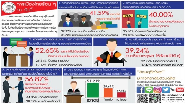 จากเหตุการณ์ทางการเมืองที่ร้อนระอุอยู่ในขณะนี้ ประชาชนสามารถติดตามข่าวจากสื่อต่าง ๆ ได้อย่างรวดเร็ว โดยเฉพาะข่าวการเมืองที่ร้อนแรงยิ่งขึ้น ไม่ว่าจะเป็นการจัดตั้งพรรคการเมือง การยื่นตีความกฎหมายลูก การเคลื่อนไหวของพรรคต่าง ๆ สวนดุสิตโพล มหาวิทยาลัยสวนดุสิต สำรวจความคิดเห็นของประชาชนทั่วประเทศ 1,236 คน ระหว่างวันที่ 20-24 มี.ค. เพื่อสะท้อนความคิดเห็นของประชาชนที่มีต่อการเมืองไทย พบว่า กรณีการยื่นขอจดจัดตั้งพรรคการเมืองใหม่ ที่ถึงขณะนี้มีกว่า 60 พรรคนั้น อันดับหนึ่ง 41.59% ประชาชนอยากได้พรรคการเมืองที่ดี มีคุณภาพ เน้นทำประโยชน์เพื่อประชาชน ตามด้วย 39.27% เห็นว่าประชาชนมีทางเลือกหลากหลายมากขึ้น มีทั้งพรรคเก่าและใหม่ และ 37.72% เห็นว่ามีจำนวนมาก อาจก่อให้เกิดความสับสน จำไม่ได้ สำหรับกรณี คสช. ใช้ ม.44 ให้นายสมชัย ศรีสุทธิยากร พ้นจากตำแหน่ง กกต. พบว่า 39.24% ต้องการให้ชี้แจงเหตุผล ที่มาที่ไปให้สังคมได้รับรู้ เพื่อความเข้าใจที่ถูกต้อง รองลงมา 32.72% เป็นการใช้อำนาจมากเกินไป ควรคำนึงถึงผลกระทบที่จะตามมา และ 32.46% กระทบต่อภาพลักษณ์ของ คสช. มีผลต่อความเชื่อมั่น ส่วนยังคิดว่า พล.อ.ประยุทธ์ ในฐานะหัวหน้า คสช.และนายกรัฐมนตรี จะควบคุมสถานการณ์ (เอาอยู่) หรือไม่? พบว่า 51.21% คิดว่าเอาอยู่ เพราะมีอำนาจพิเศษ มีกำลังทหาร เด็ดขาด ตั้งใจที่จะแก้ปัญหา น่าจะสามารถควบคุมสถานการณ์ได้ 29.61% ไม่แน่ใจ เพราะต้องรอดูต่อไป ขึ้นอยู่กับการเคลื่อนไหว ทุกอย่างเกิดขึ้นได้เสมอ สถานการณ์ไม่แน่นอน ขณะที่ 19.18% เอาไม่อยู่ เพราะบ้านเมืองมีปัญหาหลายด้าน แก้ไขได้ยาก มีทั้งกลุ่มที่เห็นด้วยและไม่เห็นด้วย ประชาชนขาดความเชื่อมั่น เมื่อถามกรณี สนช. ยื่นศาลรัฐธรรมนูญตีความกฎหมายลูก ว่าด้วยการได้มาซึ่ง ส.ว. ประชาชน 40% เห็นว่า อยากให้พิจารณาอย่างตรงไปตรงมา ไม่ขัดกับกฎหมาย 35.36% คิดว่าจะเกิดกระแสวิพากษ์วิจารณ์ ทำให้คนบางกลุ่มไม่พึงพอใจ และ 28.10% เห็นว่าอาจมีผลต่อการเลือกตั้ง เป็นการยื้อเวลา