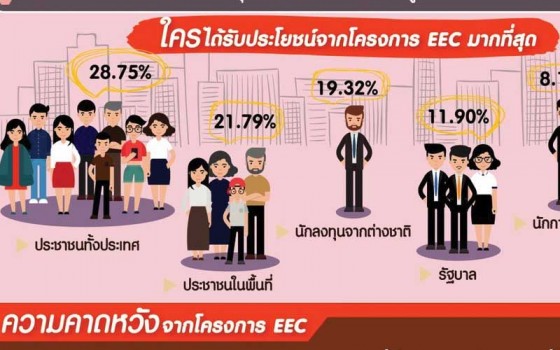ศูนย์สำรวจความคิดเห็น “นิด้าโพล” สถาบันบัณฑิตพัฒนบริหารศาสตร์(นิด้า) เปิดเผยผลสำรวจความคิดเห็นของประชาชน เรื่อง “EEC ใครได้ประโยชน์ ?” สำรวจระหว่างวันที่ 22-23 มีนาคม 2561 จากประชาชนที่มีอายุ 18 ปีขึ้นไป กระจายทุกภูมิภาค ระดับการศึกษา และอาชีพทั่วประเทศ รวมทั้งสิ้น จำนวน 1,501 หน่วยตัวอย่าง เกี่ยวกับโครงการพัฒนาระเบียงเศรษฐกิจพิเศษภาคตะวันออก (EEC) การสำรวจเก็บข้อมูลด้วยวิธีการสัมภาษณ์ทางโทรศัพท์ โดยกำหนดค่าความเชื่อมั่นที่ร้อยละ 95.0 จากการสำรวจ เมื่อถามถึงการรับรู้หรือได้ยินข้อมูลข่าวสารเกี่ยวกับโครงการพัฒนาระเบียงเศรษฐกิจพิเศษภาคตะวันออก (EEC) พบว่า ประชาชนส่วนใหญ่ ร้อยละ 56.90 ระบุว่า ไม่เคยรับรู้/ไม่เคยได้ยิน ร้อยละ 43.10 ระบุว่า เคยรับรู้/เคยได้ยิน โดยประชาชนส่วนใหญ่ ร้อยละ 69.81 รับรู้หรือได้ยินข้อมูลข่าวสาร จากโทรทัศน์ รองลงมา ร้อยละ 9.84 ระบุว่า Social Media (Facebook , Line , Twitter , etc.) ร้อยละ 6.12 ระบุว่า ญาติพี่น้อง/เพื่อน/คนรู้จัก ร้อยละ 5.05 ระบุว่า วิทยุ ร้อยละ 4.12 ระบุว่า เว็บไซต์ ร้อยละ 3.72 ระบุว่า หนังสือพิมพ์ ร้อยละ 0.93 ระบุว่า ป้ายประกาศ/แผ่นพับ/ใบปลิว และร้อยละ 0.40 ระบุว่า นิตยสาร เมื่อถามถึงความหมายของ “โครงการพัฒนาระเบียงเศรษฐกิจพิเศษภาคตะวันออก (EEC)” ว่าคืออะไร พบว่า ประชาชนส่วนใหญ่ ร้อยละ 51.00 ระบุว่า เป็นการพัฒนาโครงสร้างพื้นฐานคมนาคมและโลจิสติกส์ เชื่อมโยงกันอย่างมีประสิทธิภาพ เช่น รถไฟความเร็วสูงเชื่อมโยง 3 สนามบิน สุวรรณภูมิ ดอนเมือง และอู่ตะเภา มีรถไฟรางคู่ ท่าเรือแหลมฉบัง ถนน Motorway รองลงมา ร้อยละ 48.53 ระบุว่า เป็นเขตเศรษฐกิจพิเศษ เพื่อส่งเสริมอุตสาหกรรมใหม่ ในบริเวณพื้นที่ 3 จังหวัด ได้แก่ ฉะเชิงเทรา ชลบุรี และระยอง ร้อยละ 37.56 ระบุว่า เป็นโครงการเพื่อยกระดับให้ประเทศไทยเป็นศูนย์กลางเศรษฐกิจชั้นนำของเอเชีย ร้อยละ 31.38 ระบุว่า เป็นแผนยุทธศาสตร์ภายใต้นโยบาย ไทยแลนด์ 4.0 เพื่อยกระดับประเทศให้มีความเป็นอยู่ที่ดีขึ้น ร้อยละ 25.81 ระบุว่า เป็นการพัฒนาด้านสาธารณูปโภค สาธารณูปการ การพัฒนาเมือง ทั้งการท่องเที่ยวและสาธารณสุข ร้อยละ 24.57 ระบุว่า เป็นการพัฒนาด้านพลังงานและอุตสาหกรรมที่ใช้ เทคโนโลยีขั้นสูง เป็นมิตรกับสิ่งแวดล้อม และร้อยละ 5.87 ไม่ระบุ/ไม่แน่ใจ สำหรับความคิดเห็นต่อผู้ที่จะได้รับประโยชน์จากโครงการพัฒนาระเบียงเศรษฐกิจพิเศษภาคตะวันออก (EEC) มากที่สุด พบว่า ประชาชนส่วนใหญ่ ร้อยละ 28.75 ระบุว่า ประชาชนทั้งประเทศ รองลงมา ร้อยละ 21.79 ระบุว่า ประชาชนในพื้นที่ที่มีโครงการ ร้อยละ 19.32 ระบุว่า นักลงทุนจากต่างชาติ ร้อยละ 11.90 ระบุว่า รัฐบาล ร้อยละ 8.19 ระบุว่า นักการเม