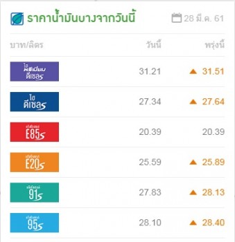 บริษัท ปตท.จำกัด (มหาชน) และบริษัทบางจากคอร์ปอเรชั่น จำกัด (มหาชน) ประกาศ ปรับขึ้นราคาขายปลีกน้ำมันทุกชนิดลิตรละ 30 สตางค์ เว้น E85 คงเดิม มีผลพรุ่งนี้ (29 มี.ค.) เวลา 05.00 น.ส่งผลให้ราคาใหม่ในสถานีบริการน้ำมันเขตกรุงเทพมหานคร และปริมณฑล ในส่วนของ ปตท.เป็นดังนี้ เบนซิน 95 : 35.46 บาท แก๊สโซฮอล 95 : 28.35 บาท แก๊สโซฮอล 91 : 28.08 บาท E20 : 25.84 บาท E85 : 20.34 บาท ดีเซล : 27.59 บาท