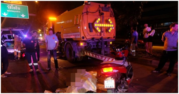 เมื่อกลางดึกที่ผ่านมา ร้อยตำรวจโทหญิง ธีรานุช พรหมอยู่ รองสารวัตรสอบสวน สถานีตำรวจนครบาลสุทธิสาร ได้รับแจ้งอุบัติเหตุรถจักรยานยนต์ชนท้ายรถดูดฝุ่น สำนักงานเขตดินแดง กทม. มีผู้เสียชีวิต 1 ราย บริเวณถนนรัชดาภิเษก ขาออก ก่อนขึ้น สะพานข้ามแยกรัชดา-ลาดพร้าว แขวงและเขตดินแดง จึงนำกำลังไปตรวจสอบ พร้อมเจ้าหน้าที่อาสามูลนิธิป่อเต็กตึ๊ง ที่เกิดเหตุเป็นถนน 4 เลน ตรงเลนขวาริมเกาะกลางถนน พบรถดูดฝุ่นสีเหลือง ทะเบียน 78-4225 กรุงเทพมหานคร จอดเปิดไฟกระพริบอยู่ ท้ายรถกันชนหักครึ่ง ใกล้กันพบศพ นายเทอดศักดิ์ สุโขธนัง อายุ 45 ปี เจ้าหน้าที่กู้ภัยทางด่วน 2 สวมเครื่องแบบกู้ภัยสีส้ม ใส่หมวกกันน็อกเต็มใบสีดำ มีบาดแผลกะโหลกศีรษะแตก ข้อมือขวาเกือบขาด ขาหักผิดรูป ส่วนรถจักรยานยนต์ทะเบียน 3 กซ 9340 กรุงเทพมหานคร สภาพหน้ารถ พังเสียหายยับเยิน นายสุกิจ แสนวิลัย อายุ 34 ปี พนักงานขับรถดูดฝุ่นสำนักงานเขตดินแดง ให้การว่า ก่อนเกิดเหตุ ขับรถดูดฝุ่นเปิดไฟสัญญาณกระพริบ ปฎิบัติหน้าที่ทำความสะอาดถนนอยู่ ที่ช่องเลนขวาสุด ถนนรัชดาภิเษกช่วงแยกสุทธิสารถึงแยกรัชดา-ลาดพร้าว จนมาถึง จุดเกิดเหตุ จู่ๆรถสั่นและมีเสียงดังสนั่นบริเวณท้ายรถ จึงจอดรถลงมาดูพบว่ามีรถ จักรยานยนต์ มาชนท้ายรถ จึงรีบแจ้งเจ้าหน้าที่ทราบ เบื้องต้นเจ้าหน้าที่ตำรวจ คาดว่าหลังจากเลิกงาน นายเทอดศักดิ์ขับรถจักรยานยนต์ กลับบ้านพักย่านบางกรวย แต่ขณะขับขี่ เกิดหลับใน จนไปพุ่งชนท้ายรถดูดฝุ่นเสียชีวิต