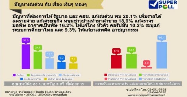สำนักวิจัยซูเปอร์โพล เปิดเผยผลสำรวจเรื่อง ปัญหาเร่งด่วนกับเรื่องเงินๆ ทองๆ จากกรณีศึกษาตัวอย่างประชาชนทุกสาขาอาชีพ จำนวน 1,585 ตัวอย่าง ระหว่าง วันที่ 20–31 มี.ค. พบว่า ปัญหาเร่งด่วนเงินๆ ทองๆ ที่ต้องการให้ รัฐบาล และ คสช. เร่งแก้ไขมากที่สุด ร้อยละ 20.1 ระบุ เพิ่มรายได้ ลดรายจ่าย แก้เศรษฐกิจ หนุนชาวบ้านทำมาค้าขาย ร้อยละ 18.9 จราจร มลพิษ อากาศเป็นพิษ ตามด้วย แก้โกง หัวคิว คอรัปชั่น แก้ระบบการศึกษา ความไม่เป็นธรรม ไม่ยุติธรรม ยาเสพติด อาชญากรรม ส่วนความมั่นคงทางการเงินในอีก 6 เดือนข้างหน้า ส่วนใหญ่ หรือ ร้อยละ 66.1 ระบุ มั่นคง ขณะที่ร้อยละ 33.9 ไม่มั่นคง โดยกลุ่มที่น่าเป็นห่วง คือ กลุ่มที่มีรายได้น้อยไม่เกิน 15,000 บาทต่อเดือน มีความไม่มั่นคงทางการเงินสูงสุดถึงร้อยละ 47.6 ส่วนกลุ่มที่มีรายได้ปานกลางระหว่าง 15,001-35,000 บาทต่อเดือน ร้อยละ 22 ไม่มีความมั่นคงทางการเงิน และส่วนใหญ่คือ ร้อยละ 77.5 พึ่งธนาคาร หาสินเชื่อ เมื่อร้อนเงิน ที่น่าสนใจ คือ คุณสมบัติของนายกรัฐมนตรีที่ประชาชนต้องการ พบว่า ประชาชนส่วนใหญ่ ร้อยละ 43.9 ต้องการนายกฯ ที่มีความซื่อสัตย์ สุจริต ร้อยละ 23.8 มีคุณธรรม ปกป้องเชิดชู เทิดทูนสถาบันสำคัญของชาติ รองลงมา มีความเป็นผู้นำ เด็ดขาด ไม่หย่อนผ่อนปรน มีความเป็นประชาธิปไตย ฟังเสียงประชาชน ใจเย็น ฉลาดรอบรู้ รับผิดชอบในสิ่งที่พูด