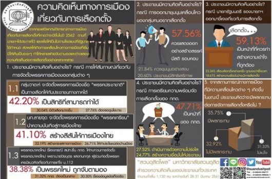 จากกระแสวิพากษ์วิจารณ์ทางการเมืองเกี่ยวกับการเลือกตั้ง ที่คาดว่าจะมีขึ้นในปี 2562 ตามที่นายกฯประกาศไว้ และเพื่อให้เป็นไปตามโรดแมปที่รัฐบาลกำหนด ส่งผลให้เกิดการเคลื่อนไหวทางการเมืองที่เริ่มมีให้เห็นเป็นระยะ ๆ ทำให้หลายฝ่ายจับตามองและต่างแสดงความคิดเห็นต่อการเลือกตั้งอย่างหลากหลาย “สวนดุสิตโพล” มหาวิทยาลัยสวนดุสิต สำรวจความคิดเห็นของประชาชนทั่วประเทศ 1,130 คน ระหว่างวันที่ 28-31 มีนาคม เพื่อสะท้อนความคิดเห็นของประชาชน สรุปว่า กรณีการให้สัมภาษณ์เกี่ยวกับการจัดตั้งพรรคการเมืองของกลุ่มต่าง ๆ 1.กลุ่มวาดะห์ จะจัดตั้งพรรคการเมืองชื่อ"พรรคประชาชาติ"เป็นทางเลือกให้แก่ประชาชนทางภาคใต้ ประชาชนร้อยละ 42.20 ระบุว่า เป็นสิทธิที่สามารถทำได้ ขอให้ตั้งใจทำเพื่อส่วนรวมอย่างแท้จริง ร้อยละ 30.04 มีตัวเลือกมากขึ้น เป็นทางเลือกใหม่ ร้อยละ 27.76 ประชาชนรู้จัก เป็นคนในพื้นที่ ต้องรอดูนโยบาย 2.บก.ลายจุด จะจัดตั้งพรรคการเมืองชื่อ "พรรคเกรียน" นำความบันเทิงสู่การเมืองไทย ร้อยละ 41.10 สร้างสีสันให้การเมืองไทย น่าสนใจ ร้อยละ 32.19 เป็นการสร้างจุดเด่นให้พรรค สร้างกระแสทางการเมือง ร้อยละ 26.71 อยากให้ทำในสิ่งที่เป็นประโยชน์ต่อบ้านเมือง 3.พรรคอนาคตใหม่ ชี้แจงกรณี สปท.ยื่น กกต. ให้ทบทวนการจัดตั้งพรรคอนาคตใหม่ เพราะนายปิยบุตร แสงกนกกุล ผู้ร่วมก่อตั้งพรรคเคยมีแนวคิดเกี่ยวกับการแก้ไข ม.112 ร้อยละ 38.38 เป็นพรรคใหม่ มาแรง จึงถูกจับตามองเป็นพิเศษ ร้อยละ 31.32 กกต. ต้องเป็นกลาง พิจารณาให้รอบคอบ โปร่งใส ยุติธรรม ร้อยละ 30.30 พรรคอนาคตใหม่ควรชี้แจงให้ทุกฝ่ายได้รับทราบข้อมูลข้อเท็จจริง ส่วนประชาชนมีความคิดเห็นอย่างไร? กรณีการออกมาชุมนุมเคลื่อนไหวของกลุ่มคนอยากเลือกตั้ง ส่วนใหญ่ ร้อยละ 57.56 เห็นว่า ควรแสดงออกทางการเมืองอย่างสร้างสรรค์ มีสติ รอบคอบ ร้อยละ 21.84 ควรชุมนุมอย่างสงบ ไม่อยากให้เกิดความขัดแย้ง รุนแรง และร้อยละ 21.84 สามารถทำได้ ประชาชนมีสิทธิเสรีภาพ ไม่ควรปิดกั้น ประเด็น ประชาชนมีความคิดเห็นอย่างไร? กรณีนายกรัฐมนตรี รองนายกรัฐมนตรี ออกมาชี้แจงเกี่ยวกับการเลือกตั้ง ส่วนใหญ่ หรือร้อยละ 59.13 ระบุ เป็นหน้าที่ที่ควรทำ เพื่อสร้างความเข้าใจที่ถูกต้อง ชัดเจน รองลงมา เลื่อนเลือกตั้งมาแล้วหลายครั้ง ถูกมองว่าเป็นการยื้อเวลา และสร้างความเชื่อมั่นให้ประชาชนว่าจะมีการเลือกตั้งเกิดขึ้นจริง กรณีการเตรียมความพร้อมจัดการเลือกตั้งของ กกต. ปชช.ร้อยละ 47.71 มองว่า เป็นหน้าที่ของ กกต.เตรียมความพร้อมเข้าสู่การเลือกตั้ง ตามด้วย อยากให้ กกต.ดำเนินการด้วยความโปร่งใส ตรวจส