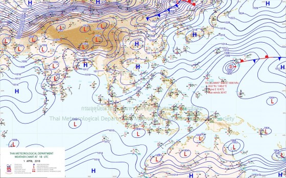 พยากรณ์อากาศ 24 ชั่วโมงข้างหน้า ไทยตอนบนยังคงมีฝนฟ้าคะนองเกิดขึ้นได้ในระยะนี้ โดยภาคเหนือและภาคกลางมีฝนฟ้าคะนองและลมกระโชกแรง ขอให้ประชาชนบริเวณดังกล่าว ระมัดระวังอันตรายจากฝนฟ้าคะนองและลมกระโชกแรงไว้ด้วย สำหรับภาคใต้มีฝนฟ้าคะนองหลายพื้นที่ และมีฝนตกหนักบางแห่ง ขอให้ประชาชนบริเวณภาคใต้ระวังอันตรายจากฝนตกหนักในระยะนี้ - ภาคเหนือ อากาศร้อนทางด้านตะวันตกและทางตอนล่างของภาค กับมีฝนฟ้าคะนอง ร้อยละ 60 ของพื้นที่ และมีลมกระโชกแรงบางแห่ง - ภาคอีสาน มีฝนฟ้าคะนอง ร้อยละ 10 - ภาคกลาง ภาคตะวันออก มีฝนฟ้าคะนอง ร้อยละ 40 - ภาคใต้ทั้งสองฝั่ง กรุงเทพมหานครและปริมณฑล มีฝนฟ้าคะนอง ร้อยละ 60 ของพื้นที่ และฝนตกหนักบางแห่ง ทั้งนี้ ช่วงวันที่ 5-7 เมษายน บริเวณความกดอากาศสูงจากประเทศจีนจะแผ่ลงมาปกคลุมประเทศไทยตอนบนและทะเลจีนใต้ ขณะที่ประเทศไทยอากาศร้อน ทำให้บริเวณดังกล่าวมีพายุฤดูร้อนเกิดขึ้น โดยจะเริ่มมีผลกระทบในภาคตะวันออกเฉียงเหนือและภาคตะวันออกก่อน ส่วนภาคอื่น ๆ จะได้รับผลกระทบในวันถัดไป จึงขอให้ประชาชนในบริเวณดังกล่าว ระวังอันตรายจากพายุฤดูร้อนที่จะเกิดขึ้น หลีกเลี่ยงการอยู่ในที่โล่งแจ้ง ใต้ต้นไม้ใหญ่ และป้ายโฆษณาที่ไม่แข็งแรง รวมถึงระวังอันตรายจากฟ้าผ่า สำหรับเกษตรกรควรเตรียมการป้องกันและระวังความเสียหายที่จะเกิดต่อผลผลิตทางการเกษตรไว้ด้วย