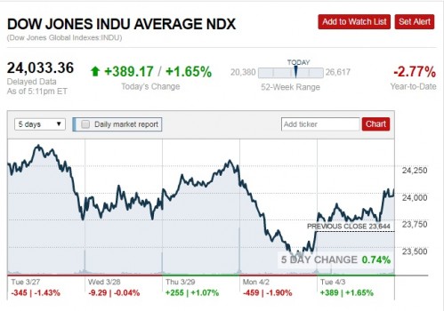 ดัชนีเฉลี่ยอุตสาหกรรมดาวโจนส์ ตลาดหุ้นนิวยอร์ก ปิดที่ 24,033.36 จุด พุ่งขึ้น 389.17 จุด หรือ +1.65% ดัชนี S&P500 ปิดที่ 2,614.45 จุด เพิ่มขึ้น 32.57 จุด หรือ +1.26% และ ดัชนี Nasdaq ปิดที่ 6,941.28 จุด เพิ่มขึ้น 71.16 จุด หรือ +1.04% ดัชนีดาวโจนส์ตลาดหุ้นนิวยอร์กปิด พุ่งขึ้นเมื่อคืนนี้ (3 เม.ย.) ได้แรงหนุนจากการดีดตัวขึ้น ของหุ้นกลุ่มเทคโนโลยีโ ขณะที่นักลงทุนจับตารายงานผลประกอบการของธนาคารรายใหญ่ ของสหรัฐ รวมทั้งตัวเลขจ้างงานนอกภาคเกษตรประจำเดือนมี.ค.ของสหรัฐ