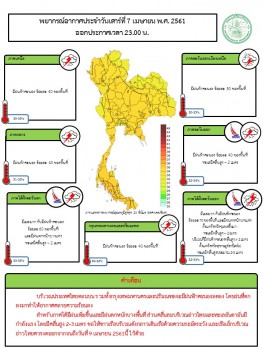 พยากรณ์อากาศ 24 ชั่วโมงข้างหน้า ไทยตอนบน รวมทั้งกรุงเทพมหานครและปริมณฑล จะมีฝนฟ้าคะนองลดลง โดยฝนที่ตกลงมาทำให้อากาศคลายความร้อนลง สำหรับภาคใต้ฝนเพิ่มขึ้นและฝนตกหนักบางพื้นที่ ส่วนคลื่นลมบริเวณอ่าวไทยและทะเลอันดามันกำลังแรง มีคลื่นสูง 2-3 เมตร ขอให้ชาวเรือบริเวณดังกล่าวเดินเรือด้วยความระมัดระวัง และเรือเล็กบริเวณอ่าวไทยควรงดออกจากฝั่ง จนถึงวันที่ 9 เมษายน - ภาคเหนือ มีฝนฟ้าคะนอง ร้อยละ 40 ของพื้นที่ อุณหภูมิต่ำสุด 17-22 องศาเซลเซียส สูงสุด 30-33 องศาฯ - ภาคตะวันออกเฉียงเหนือ ฝนฟ้าคะนอง ร้อยละ 30 ของพื้นที่ อุณหภูมิต่ำสุด 16-20 องศาเซลเซียส สูงสุด 30-33 องศาฯ - ภาคกลาง ภาคตะวันออก ฝนฟ้าคะนอง ร้อยละ 40 ของพื้นที่ - ภาคใต้ (ฝั่งตะวันออก) มีฝนฟ้าคะนอง ร้อยละ 70 และมีฝนตกหนักบางแห่ง บริเวณจังหวัดเพชรบุรี ประจวบคีรีขันธ์ ชุมพร และสุราษฎร์ธานี ทะเลคลื่นสูงประมาณ 2 เมตร บริเวณที่มีฝนฟ้าคะนองคลื่นสูงมากกว่า 2 เมตร ตั้งแต่จังหวัดสุราษฎร์ธานีลงไป ทะเลคลื่นสูงประมาณ 2-3 เมตร - ภาคใต้ (ฝั่งตะวันตก) ฝนฟ้าคะนอง ร้อยละ 60 และตกหนักบางแห่ง บริเวณจังหวัดระนอง พังงา ภูเก็ต และกระบี่ ทะเลคลื่นสูงประมาณ 2 เมตร - กรุงเทพมหานครและปริมณฑล ฝนฟ้าคะนอง ร้อยละ 20 ของพื้นที่ อุณหภูมิต่ำสุด 22-23 องศาเซลเซียส สูงสุด 30-32 องศาฯ