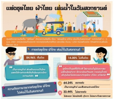 ศูนย์สำรวจความคิดเห็นนิด้าโพล สถาบันบัณฑิตพัฒนบริหารศาสตร์ เปิดเผยผลสำรวจความคิดเห็นของประชาชน เรื่อง “แต่งชุดไทย ผ้าไทย เล่นน้ำในวันสงกรานต์” สำรวจระหว่างวันที่ 4 – 5 เม.ย. โดยสอบถามความคิดเห็นจากประชาชนทั่วประเทศ 1,250 หน่วยตัวอย่าง เกี่ยวกับการแต่งชุดไทย ผ้าไทย เล่นน้ำในวันสงกรานต์ โดยเมื่อถามถึงการแต่งชุดไทย ผ้าไทย เล่นน้ำในเทศกาลสงกรานต์พบว่า ประชาชนส่วนใหญ่ ร้อยละ 84.96 ระบุว่า เห็นด้วย เพราะเป็นการอนุรักษ์ความเป็นไทย ส่งเสริมวัฒนธรรมไทย แสดงถึงความเป็นไทย และอยากให้ชาวต่างชาติได้เห็นถึงวัฒนธรรมไทยอย่างแท้จริง เป็นประเพณีไทยที่มีมาแต่โบราณ และดูเรียบร้อย สวยงาม รองลงมา ร้อยละ 14 ระบุว่า ไม่เห็นด้วย เพราะชุดไทยเป็นชุดที่มีเกียรติจะใส่มาเล่นน้ำดูไม่เหมาะสม เคลื่อนไหวลำบาก ไม่สะดวก ราคาค่อนข้างแพง ดูสิ้นเปลือง และกลัวชุดพัง เพราะโดนน้ำ ขณะที่บางส่วนระบุว่า การเล่นน้ำของเด็กรุ่นใหม่ไม่ค่อยเหมาะกับชุดไทยผ้าไทย เท่าไรนัก และร้อยละ 1.04 ไม่ระบุ/ไม่แน่ใจ สำหรับความต้องการอยากแต่งชุดไทย ผ้าไทย ไปเล่นน้ำสงกรานต์ พบว่า ประชาชนส่วนใหญ่ ร้อยละ 64.24 ระบุว่าอยากแต่ง เพราะเป็นการอนุรักษ์ความเป็นไทย สืบสานประเพณีไทย และจะได้เป็นแบบอย่างให้กับคนรุ่นหลัง รองลงมา ร้อยละ 33.44 ระบุว่า ไม่อยากแต่ง เพราะไม่สะดวกไม่คล่องตัว ยุ่งยาก ไม่เหมาะกับสภาพอากาศที่ค่อนข้างร้อน ชุดราคาค่อนข้างแพง หาซื้อยาก ขณะที่บางส่วนระบุว่า ไม่กล้าใส่ และร้อยละ 2.32 ไม่ระบุ/ไม่แน่ใจ