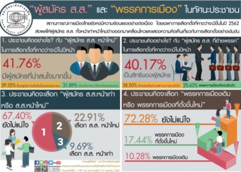 สวนดุสิตโพล โดยมหาวิทยาลัยสวนดุสิต สำรวจความคิดเห็นประชาชนที่มีสิทธิเลือกตั้งทั่วประเทศ 1,187 คน ระหว่างวันที่ 3-7 เมษายน เกี่ยวกับความคิดเห็นต่อ “ผู้สมัคร ส.ส.” และ “พรรคการเมือง” พบว่า สำหรับ “ผู้สมัคร ส.ส. หน้าใหม่” ในการเลือกตั้งที่คาดว่าจะมีในปีหน้า ประชาชน 41.76% เห็นว่า มีความหลากหลาย มีผู้สมัครที่น่าสนใจมากขึ้น 39.35% เป็นทางเลือกใหม่ ขึ้นอยู่กับการตัดสินใจของประชาชน และ 31.89% ยังมีเวลา ต้องพิจารณาให้ละเอียดรอบคอบ ส่วน “ผู้สมัคร ส.ส.ที่ย้ายพรรค” 40.17% เห็นว่า สามารถทำได้ เป็นสิทธิของผู้สมัคร 38.50% การเมืองยังไม่นิ่ง ต้องรอติดตามสถานการณ์ต่อไป และ 25.62% พรรคการเมืองต้องปรับตัว ปรับเปลี่ยนแนวทาง หาผู้สมัครที่เหมาะสม เมื่อถามว่าจะเลือก “ผู้สมัคร ส.ส.หน้าเก่า หรือ ส.ส.หน้าใหม่” ประชาชนส่วนใหญ่ หรือ 67.40% ยังไม่แน่ใจ เพราะยังไม่ใกล้วันเลือกตั้ง ยังไม่เห็นนโยบาย ไม่รู้ว่าจะเลือกใคร ต้องรอดูก่อน ฯลฯ ขณะที่ 22.91% จะเลือก ส.ส.หน้าใหม่ เพราะอยากลองเลือกคนใหม่ ให้โอกาส ต้องการเห็นการเปลี่ยนแปลง อยากให้บ้านเมืองพัฒนา ก้าวหน้า ฯลฯ ส่วนที่จะเลือก ส.ส. หน้าเก่ามี 9.69% เพราะเป็นที่รู้จัก เป็นคนในพื้นที่ ใกล้ชิด เคยเห็นผลงาน มีประสบการณ์ ชื่นชอบมานาน ฯลฯ ส่วนประชาชนคิดจะเลือก “พรรคการเมืองเดิม หรือ พรรคการเมืองที่ตั้งขึ้นใหม่” ประชาชนส่วนใหญ่ หรือ 72.28% ยังไม่แน่ใจ เพราะอยากดูตัวบุคคลในพรรคก่อน อาจเป็นพรรคใหม่แต่คนเก่า อยากรู้รายละเอียด นโยบายและผู้สมัคร ฯลฯ ขณะที่ 17.44% จะเลือกพรรคการเมืองที่ตั้งขึ้นใหม่ เพราะเป็นตัวเลือกใหม่ น่าสนใจ เบื่อพรรคการเมืองเดิม หวังว่าจะเห็นการเปลี่ยนแปลงที่ดีขึ้น ฯลฯ และ 10.28% เลือกพรรคเดิม เพราะเป็นพรรคที่ชื่นชอบ มีชื่อเสียงมานาน เป็นที่รู้จัก ชอบคนในพรรค คนในครอบครัวชอบ ฯลฯ