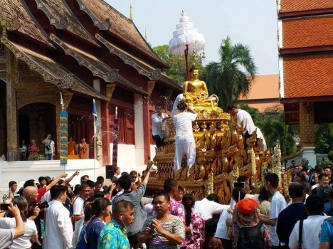 นายปวิณ ชำนิประศาสน์ ผู้ว่าราชการจังหวัดเชียงใหม่ พร้อมด้วย หัวหน้าส่วนราชการ พุทธศาสนิกชน นักธุรกิจ ชาวเชียงใหม่ และนักท่องเที่ยว ร่วมอาราธนาพระพุทธสิหิงค์ออกจากพระวิหารลายคำ วัดพระสิงห์วรมหาวิหาร อำเภอเมืองเชียงใหม่ ขึ้นประดิษฐานบนรถบุษบก และร่วมกันแห่ขบวนอัญเชิญทั้งพระพุทธสิหิงค์ , พระเสตังคมณี หรือพระแก้วขาว และพระเจ้าฝนแสนห่า เพื่อให้พี่น้องประชาชนและนักท่องเที่ยว ได้สรงน้ำและสักการะขอพร เพื่อความเป็นสิริมงคล เนื่องในวันขึ้นปีใหม่เมือง ตามประเพณีโบราณล้านนาที่สืบทอดกันมาเป็นเวลายาวนาน โดยขบวนแห่แบบล้านนา ที่ประดับตกแต่งอย่างสวยงาม วิจิตรตระการตา เริ่มขบวนที่บริเวณสี่แยกสันป่าข่อย สิ้นสุดที่วัดพระสิงห์วรมหาวิหาร มีนักท่องเที่ยวทั้งชาวไทยและต่างชาติเข้าร่วมสรงน้ำกันอย่างเนืองแน่น ส่วนการเล่นน้ำสงกรานต์ที่ จ.เชียงใหม่ เป็นไปอย่างคึกคัก ชาวเชียงใหม่ พร้อมด้วยนักท่องเที่ยวทั้งชาวไทยและต่างชาติ พากันออกมาเล่นสาดน้ำกันตามรอบคูเมืองอย่างสนุกสนาน