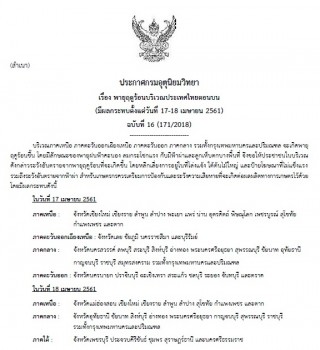 ประกาศกรมอุตุนิยมวิทยา "พายุฤดูร้อนบริเวณประเทศไทยตอนบน (มีผลกระทบตั้งแต่วันที่ 17-18 เมษายน 2561)" ฉบับที่ 16 บริเวณภาคเหนือ ภาคตะวันออกเฉียงเหนือ ภาคตะวันออก ภาคกลาง รวมทั้งกรุงเทพมหานคร และปริมณฑล จะเกิดพายุฤดูร้อนขึ้น โดยมีลักษณะของพายุฝนฟ้าคะนอง ลมกระโชกแรง กับมีฟ้าผ่าและลูกเห็บตกบางพื้นที่ จึงขอให้ประชาชนในบริเวณดังกล่าวระวังอันตรายจาก พายุฤดูร้อนที่จะเกิดขึ้น โดยหลีกเลี่ยงการอยู่ในที่โล่งแจ้ง ใต้ต้นไม้ใหญ่ และป้ายโฆษณา ที่ไม่แข็งแรง รวมถึงระวังอันตรายจากฟ้าผ่า สำหรับเกษตรกรควรเตรียมการป้องกันและ ระวังความเสียหายที่จะเกิดต่อผลผลิตทางการเกษตรไว้ด้วย โดยมีผลกระทบดังนี้ วันที่ 17 เมษายน ภาคเหนือ : จังหวัดเชียงใหม่ เชียงราย ลำพูน ลำปาง พะเยา แพร่ น่าน อุตรดิตถ์ พิษณุโลก เพชรบูรณ์ สุโขทัย กำแพงเพชร และตาก ภาคตะวันออกเฉียงเหนือ : จังหวัดเลย ชัยภูมิ นครราชสีมา และบุรีรัมย์ ภาคกลาง : จังหวัดนครสวรรค์ ลพบุรี สระบุรี สิงห์บุรี อ่างทอง พระนครศรีอยุธยา สุพรรณบุรี ชัยนาท อุทัยธานี กาญจนบุรี ราชบุรี สมุทรสงคราม รวมทั้งกรุงเทพมหานครและปริมณฑล ภาคตะวันออก : จังหวัดนครนายก ปราจีนบุรี ฉะเชิงเทรา สระแก้ว ชลบุรี ระยอง จันทบุรี และตราด วันที่ 18 เมษายน ภาคเหนือ : จังหวัดแม่ฮ่องสอน เชียงใหม่ เชียงราย ลำพูน ลำปาง สุโขทัย กำแพงเพชร และตาก ภาคกลาง : จังหวัดอุทัยธานี ชัยนาท สิงห์บุรี อ่างทอง พระนครศรีอยุธยา กาญจนบุรี สุพรรณบุรี ราชบุรี รวมทั้งกรุงเทพมหานครและปริมณฑล ภาคใต้ : จังหวัดเพชรบุรี ประจวบคีรีขันธ์ ชุมพร สุราษฎร์ธานี และนครศรีธรรมราช ทั้งนี้เนื่องจากบริเวณความกดอากาศสูงจากประเทศจีนได้แผ่ลงมาปกคลุมประเทศไทยตอนบน และทะเลจีนใต้ ในขณะที่ประเทศไทยมีอากาศร้อนถึงร้อนจัด ทำให้บริเวณดังกล่าวจะเกิดพายุฤดูร้อนขึ้น โดยมีลักษณะของพายุฝนฟ้าคะนอง ลมกระโชกแรง กับมีฟ้าผ่าและลูกเห็บตกบางพื้นที่ สำหรับลมตะวันออกที่พัดปกคลุมภาคใต้และอ่าวไทยจะมีกำลังแรงขึ้นในช่วงวันที่ 17-19 เมษายน 2561 ทำให้ภาคใต้มีฝนเพิ่มขึ้น ส่วนคลื่นลมบริเวณอ่าวไทยและทะเลอันดามัน จะมีกำลังปานกลาง โดยบริเวณอ่าวไทยมีคลื่นสูงประมาณ 2 เมตร ขอให้ชาวเรือเดินเรือ ด้วยความระมัดระวัง และติดตามประกาศจากกรมอุตุนิยมวิทยาอย่างใกล้ชิด