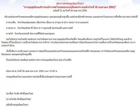 ประกาศกรมอุตุนิยมวิทยา "พายุฤดูร้อนบริเวณประเทศไทยตอนบน" (มีผลกระทบ ถึงวันที่ 18 เมษายน 2561) ฉบับที่ 21 บริเวณประเทศไทยตอนบนมีพายุฤดูร้อนลดลง และอุณหภูมิจะสูงขึ้น แต่ยังคงมีฝนฟ้า คะนองและลมกระโชกแรงบางพื้นที่ตามภาคต่าง ๆ ดังนี้ -ภาคเหนือ : จังหวัดแม่ฮ่องสอน เชียงใหม่ เชียงราย ลำพูน ลำปาง พะเยา น่าน และแพร่ -ภาคกลาง : จังหวัดอุทัยธานี ชัยนาท กาญจนบุรี สุพรรณบุรี และราชบุรี -ภาคใต้ : จังหวัดเพชรบุรี ประจวบคีรีขันธ์ และชุมพร ขอให้ประชาชนในบริเวณดังกล่าว ระวังอันตรายจากพายุฤดูร้อนที่จะเกิดขึ้น โดยหลีกเลี่ยง การอยู่ในที่โล่งแจ้ง ใต้ต้นไม้ใหญ่ และป้ายโฆษณาที่ไม่แข็งแรง รวมถึงระวังอันตรายจากฟ้าผ่า สำหรับเกษตรกรควรเตรียมการป้องกันและระวังความเสียหายที่จะเกิดต่อผลผลิตทางการ เกษตรไว้ด้วย ทั้งนี้ เนื่องจากบริเวณความกดอากาศสูงที่ปกคลุมประเทศไทยตอนบนและทะเลจีนใต้ มีกำลังอ่อนลง ทำให้ประเทศไทยตอนบนมีพายุฤดูร้อนลดลง และอุณหภูมิจะสูงขึ้น ขอให้ประชาชนติดตามประกาศจากกรมอุตุนิยมวิทยาอย่างใกล้ชิด