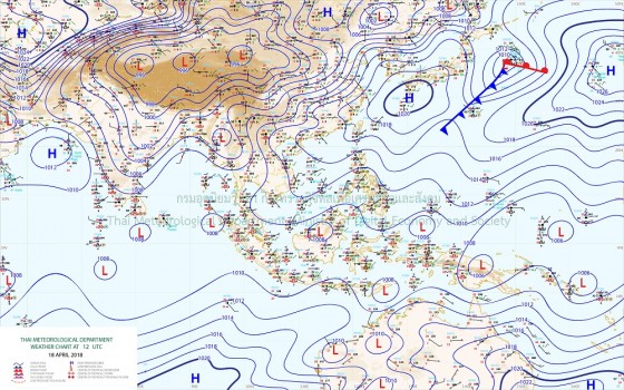 กรมอุตุนิยมวิทยา พยากรณ์อากาศ 24 ชั่วโมงข้างหน้า บริเวณประเทศไทยตอนบน มีอุณหภูมิสูงขึ้นและมีอากาศร้อนโดยทั่วไป โดยมีฝนฟ้าคะนองบางพื้นที่ ขอให้ประชาชน บริเวณดังกล่าวดูแลสุขภาพเนื่องจากสภาพอากาศที่ร้อนไว้ด้วย ลักษณะสำคัญทางอุตุนิยมวิทยา บริเวณความกดอากาศต่ำ เนื่องจากความร้อนปกคลุม ประเทศไทยตอนบน ทำให้บริเวณดังกล่าวมีอุณหภูมิสูงขึ้นและมีอากาศร้อนโดยทั่วไป ขณะที่ลมตะวันออกเฉียงใต้พัดนำความชื้นจากทะเลจีนใต้และอ่าวไทย เข้าปกคลุม ประเทศไทย ทำให้บริเวณดังกล่าวมีฝนฟ้าคะนองบางพื้นที่ กรุงเทพมหานครและปริมณฑล อากาศร้อน โดยมีฝนฟ้าคะนอง ร้อยละ 10 ของพื้นที่ อุณหภูมิต่ำสุด 25-27 องศาเซลเซียส อุณหภูมิสูงสุด 33-36 องศาเซลเซียส